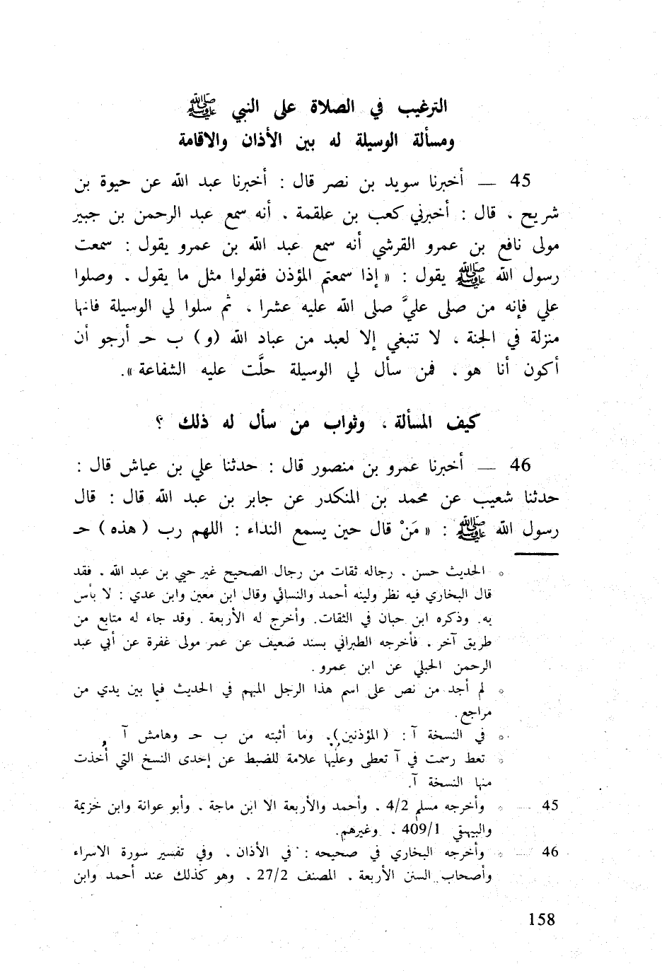 45 - أخبرنَا سُوَيْد بن نصر قَالَ أخبرنَا عبد الله عَن حَيْوَة بن شُرَيْح قَالَ أَخْبرنِي كَعْب بن عَلْقَمَة أَنه سمع عبد الرَّحْمَن بن جُبَير مولى نَافِع بن عَمْرو الْقرشِي أَنه سمع عبد الله بن عَمْرو يَقُول سَمِعت رَسُول الله صلى الله عَلَيْهِ وَسلم يَقُول إِذا سَمِعْتُمْ الْمُؤَذّن فَقولُوا مثل مَا يَقُول وصلوا عَليّ فإِنه من صلى عليَّ صلى الله عَلَيْهِ عشرا ثمَّ سلوا لي الْوَسِيلَة فإِنها منزلَة فِي الْجنَّة لَا تنبغي إِلَّا لعبد من عباد الله (و) ب ح أرجوا أَن أكون أَنا هُوَ فَمن سَأَلَ لي الْوَسِيلَة حلت عَلَيْهِ الشَّفَاعَة