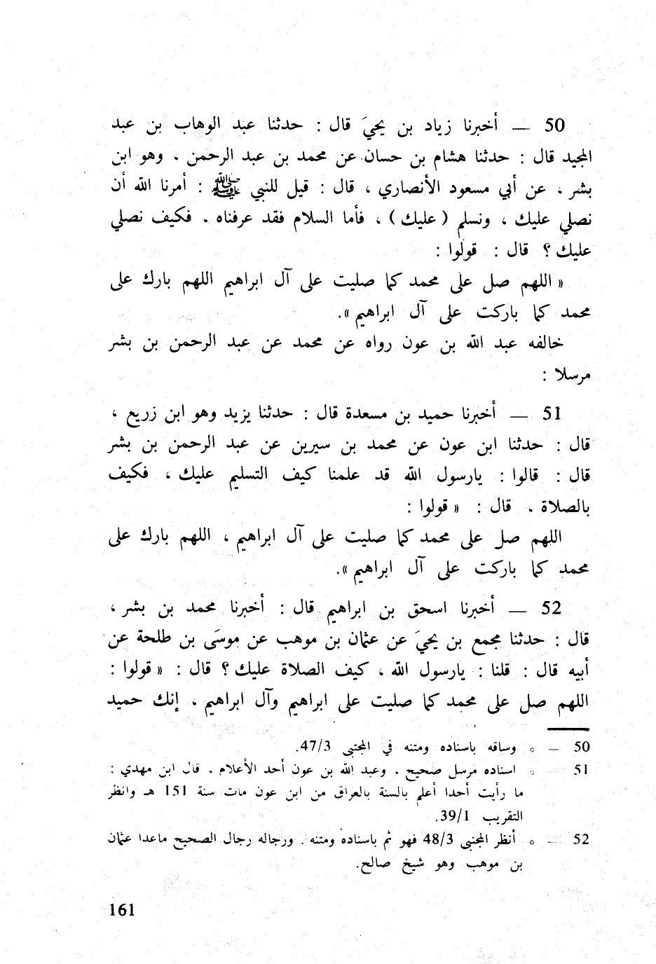 50 - أخبرنَا زِيَاد بن يحيى قَالَ حَدثنَا عبد الْوَهَّاب بن عبد الْمجِيد قَالَ حَدثنَا هِشَام بن حسان عَن مُحَمَّد بن عبد الرَّحْمَن وَهُوَ ابْن بشر عَن أبي مَسْعُود الْأنْصَارِيّ قَالَ قيل للنَّبِي صلى الله عَلَيْهِ وَسلم أمرنَا الله أَن نصلي عَلَيْك ونسلم (عَلَيْك) فَأَما السَّلَام فقد عَرفْنَاهُ فَكيف نصلي عَلَيْك قَالَ قُولُوا اللَّهُمَّ صل على مُحَمَّد كَمَا صليت على آل ابراهيم اللَّهُمَّ بَارك على مُحَمَّد كَمَا باركت على آل ابراهيم