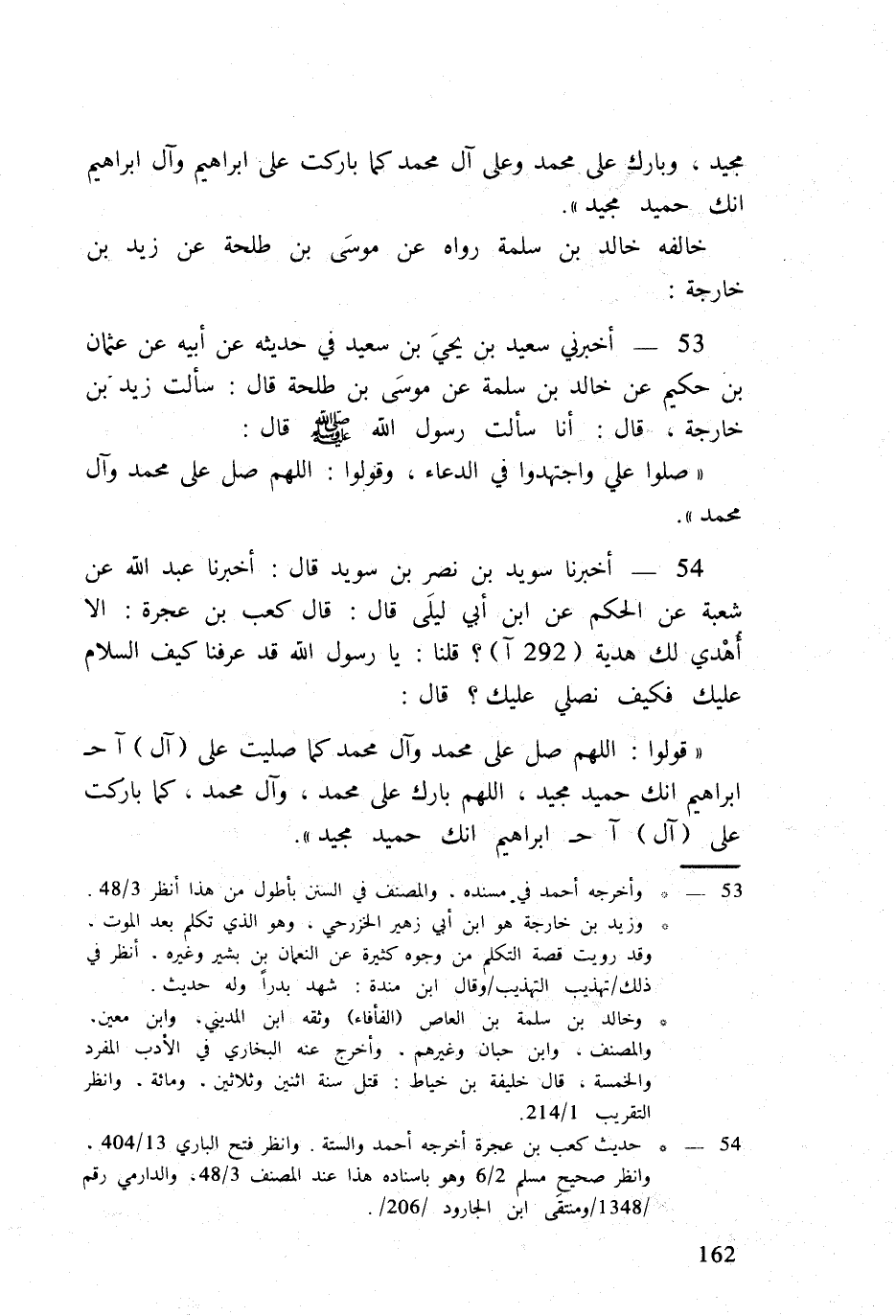 54 - أخبرنَا سُوَيْد بن نصر بن سُوَيْد قَالَ أخبرنَا عبد الله عَن شُعْبَة عَن الحكم عَن ابْن أبي ليلى قَالَ قَالَ كَعْب بن عجْرَة الا أهدي لَك هَدِيَّة (292 آ) قُلْنَا يَا رَسُول الله قد عرفنَا كَيفَ السَّلَام عَلَيْك فَكيف نصلي عَلَيْك قَالَ قُولُوا اللَّهُمَّ صل على مُحَمَّد وَآل مُحَمَّد كَمَا صليت على (آل) آح إِبْرَاهِيم إِنَّك حميد مجيد اللَّهُمَّ بَارك على مُحَمَّد وَآل مُحَمَّد كَمَا باركت على (آل) آح ابراهيم إِنَّك حميد مجيد