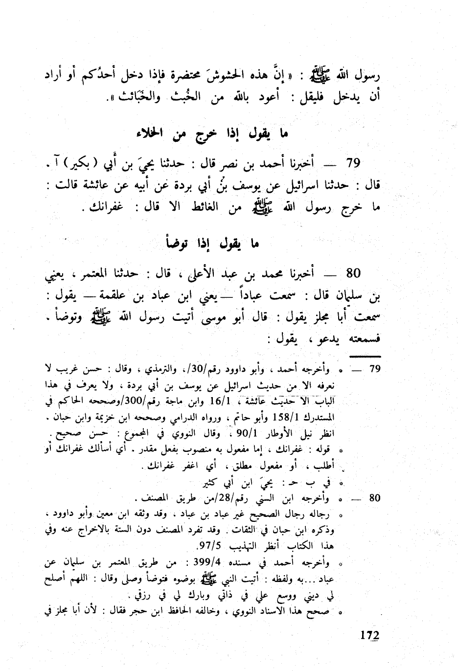 79 - أخبرنَا أَحْمد بن نصر قَالَ حَدثنَا يحيى بن أبي (بكير) آقال حَدثنَا اسرائيل عَن يُوسُف بن أبي بردة عَن أَبِيه عَن عَائِشَة قَالَت مَا خرج رَسُول الله صلى الله عَلَيْهِ وَسلم من الْغَائِط إِلَّا قَالَ غفرانك