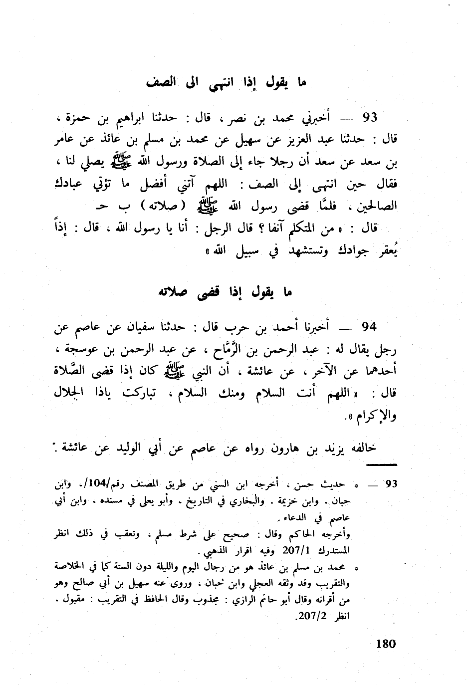 94 - أخبرنَا أَحْمد بن حَرْب قَالَ حَدثنَا سُفْيَان عَن عَاصِم عَن رجل يُقَال لَهُ عبد الرَّحْمَن بن الرماح عَن عبد الرَّحْمَن بن عَوْسَجَة أَحدهمَا عَن الآخر عَن عَائِشَة أَن النَّبِي صلى الله عَلَيْهِ وَسلم كَانَ إِذا قضى الصَّلَاة قَالَ اللَّهُمَّ أَنْت السَّلَام ومنك السَّلَام تَبَارَكت يَاذَا الْجلَال وَالْإِكْرَام