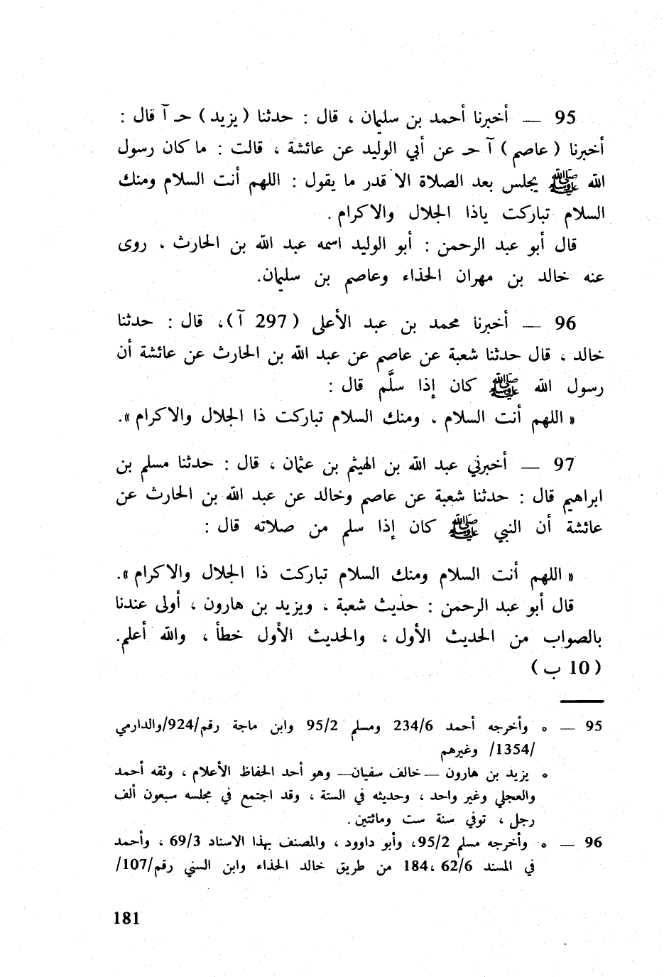 قَالَ اللَّهُمَّ أَنْت السَّلَام ومنك السَّلَام تَبَارَكت ذَا الْجلَال والاكرام قَالَ أَبُو عبد الرَّحْمَن حَدِيث شُعْبَة وَيزِيد بن هَارُون أولى عندنَا بِالصَّوَابِ من الحَدِيث الأول والْحَدِيث الأول خطأ وَالله أعلم (10 ب)