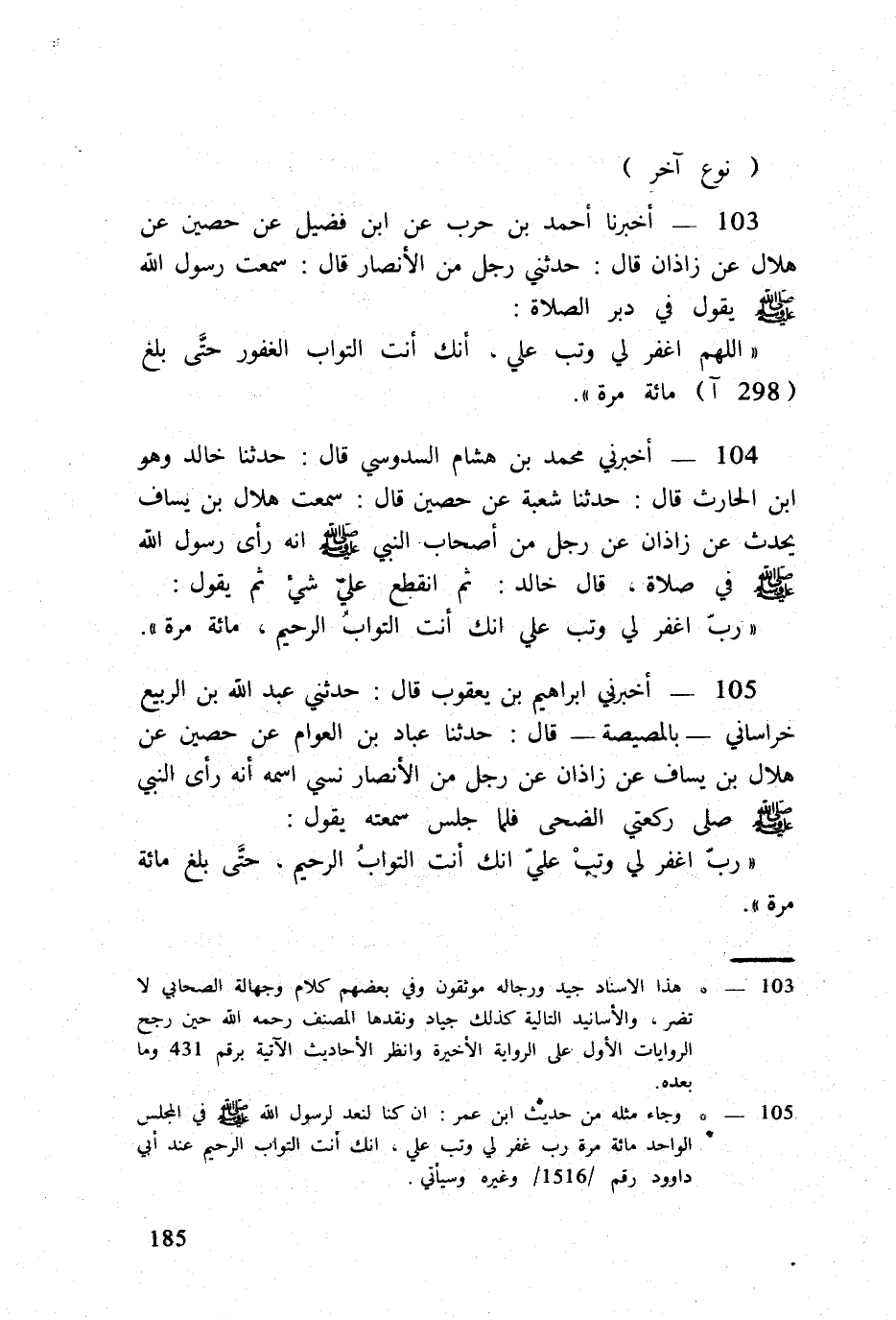 103 - أخبرنَا أَحْمد بن حَرْب عَن ابْن فُضَيْل عَن حُصَيْن عَن هِلَال عَن زَاذَان قَالَ حَدثنِي رجل من الْأَنْصَار قَالَ سَمِعت رَسُول الله صلى الله عَلَيْهِ وَسلم يَقُول فِي دبر الصَّلَاة