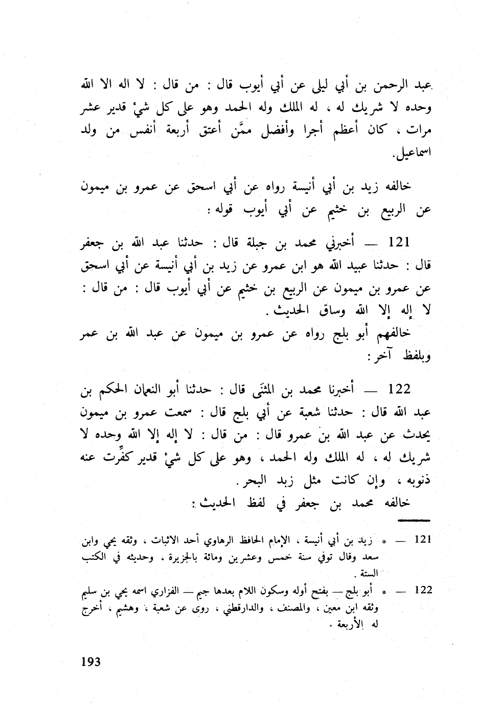 121 - أَخْبرنِي مُحَمَّد بن جبلة قَالَ حَدثنَا عبد الله بن جَعْفَر قَالَ حَدثنَا عبيد الله هُوَ ابْن عَمْرو عَن زيد بن أبي أنيسَة عَن أبي إِسْحَق عَن عَمْرو بن مَيْمُون عَن الرّبيع بن خثيم عَن أبي أَيُّوب قَالَ من قَالَ لَا إِلَه إِلَّا الله وسَاق الحَدِيث