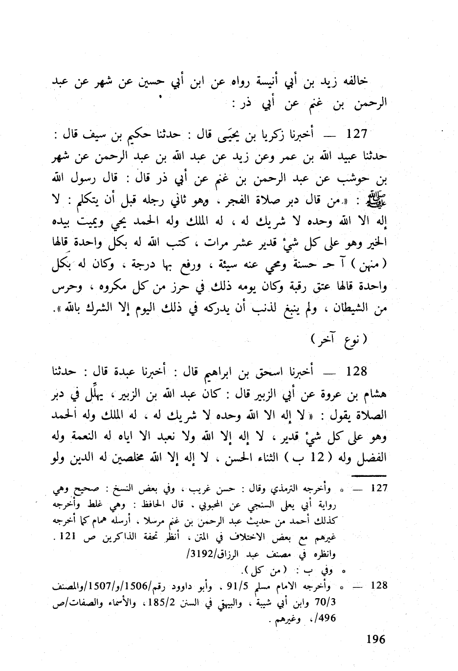 127 - أخبرنَا زَكَرِيَّا بن يحيى قَالَ حَدثنَا حَكِيم بن سيف قَالَ حَدثنَا عبيد الله بن عمر وَعَن زيد عَن عبد الله بن عبد الرَّحْمَن عَن شهر بن حَوْشَب عَن عبد الرَّحْمَن بن غنم عَن أبي ذَر قَالَ قَالَ رَسُول الله صلى الله عَلَيْهِ وَسلم من قَالَ دبر صَلَاة الْفجْر وَهُوَ ثَانِي رجله قبل أَن يتَكَلَّم لَا إِلَه إِلَّا الله وَحده لَا شريك لَهُ لَهُ الْملك وَله الْحَمد يحي وَيُمِيت بِيَدِهِ الْخَيْر وَهُوَ على كل شَيْء قدير عشر مَرَّات كتب الله لَهُ بِكُل وَاحِدَة قَالَهَا (مِنْهُنَّ) آح حَسَنَة ومحي عَنهُ سَيِّئَة وَرفع بهَا دَرَجَة وَكَانَ لَهُ بِكُل وَاحِدَة قَالَهَا عتق رَقَبَة وَكَانَ يَوْمه ذَلِك فِي حرز من كل مَكْرُوه وحرس من الشَّيْطَان وَلم يَنْبغ لذنب أَن يُدْرِكهُ فِي ذَلِك الْيَوْم إِلَّا الشّرك بِاللَّه (نوع آخر)