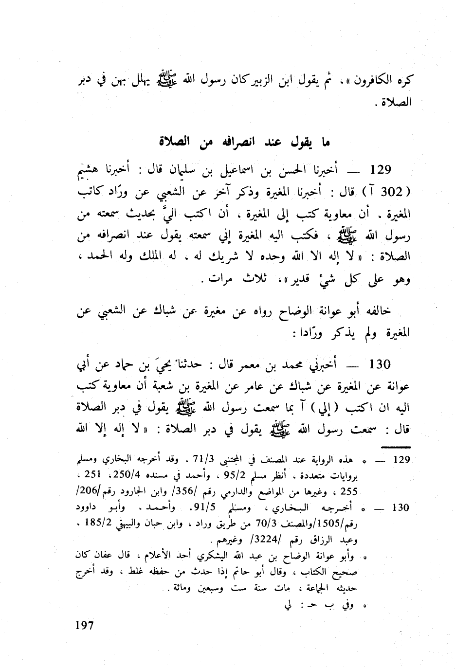 129 - أخبرنَا الْحسن بن اسماعيل بن سُلَيْمَان قَالَ أخبرنَا هشيم (302 آ) قَالَ أخبرنَا الْمُغيرَة وَذكر آخر عَن الشّعبِيّ عَن وراد كَاتب الْمُغيرَة أَن مُعَاوِيَة كتب إِلَى الْمُغيرَة أَن اكْتُبْ إِلَيّ بِحَدِيث سمعته من رَسُول الله صلى الله عَلَيْهِ وَسلم فَكتب إِلَيْهِ الْمُغيرَة إِنِّي سمته يَقُول عِنْد انْصِرَافه من الصَّلَاة لَا إِلَه إِلَّا الله وَحده لَا شريك لَهُ لَهُ الْملك وَله الْحَمد وَهُوَ على كل شَيْء قدير ثَلَاث مَرَّات