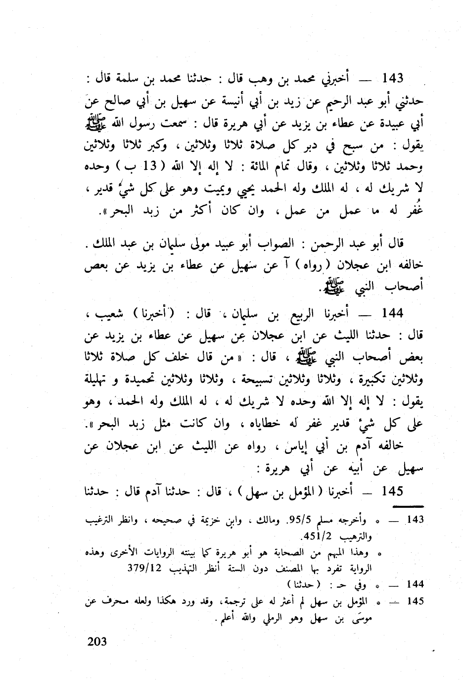 145 - أخبرنَا (المؤمل بن سهل) قَالَ حدثناآدم قَالَ حَدثنَا اللَّيْث عَن ابْن عجلَان عَن سُهَيْل عَن أَبِيه عَن ابي هُرَيْرَة قَالَ قَالَ رَسُول الله صلى الله عَلَيْهِ وَسلم من قَالَ خلف كل صَلَاة ثَلَاثًا وَثَلَاثِينَ تَكْبِيرَة وَثَلَاثًا وَثَلَاثِينَ تَسْبِيحَة وَثَلَاثًا وَثَلَاثِينَ تَحْمِيدَة وَيَقُول لَا إِلَه إِلَّا الله وَحده لَا شريك لَهُ لَهُ الْملك وَله الْحَمد وَهُوَ على كل شَيْء قدير غفرت لَهُ خطاياه وَإِن كَانَت مثل زبد الْبَحْر