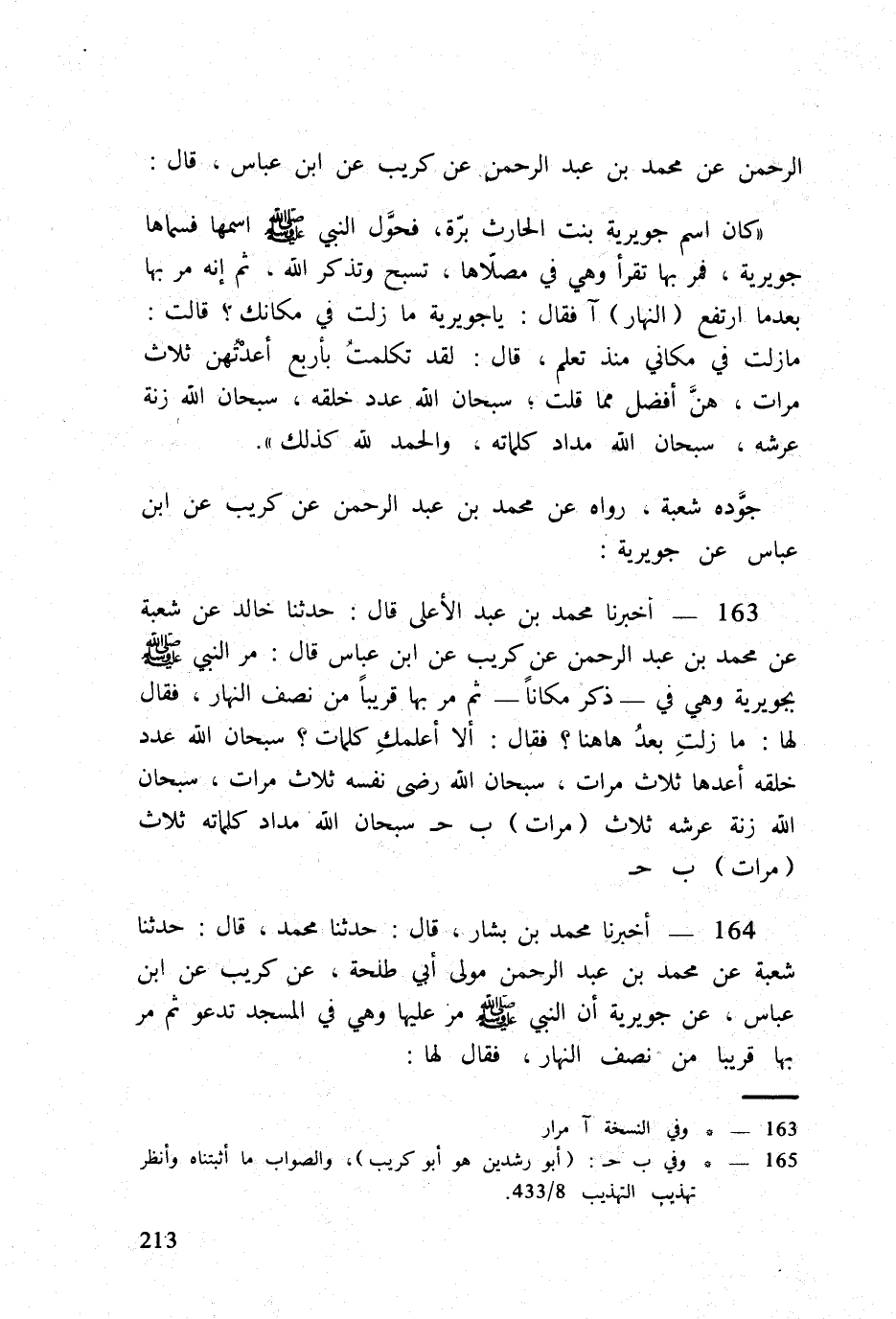 164 - أخبرنَا مُحَمَّد بن بشار قَالَ حَدثنَا مُحَمَّد قَالَ حَدثنَا شُعْبَة عَن مُحَمَّد بن عبد الرَّحْمَن مولى أبي طَلْحَة عَن كريب عَن ابْن عَبَّاس عَن جوَيْرِية أَن النَّبِي صلى الله عَلَيْهِ وَسلم مر عَلَيْهَا وَهِي فِي الْمَسْجِد تَدْعُو ثمَّ مر بهَا قَرِيبا من نصف النَّهَار فَقَالَ لَهَا