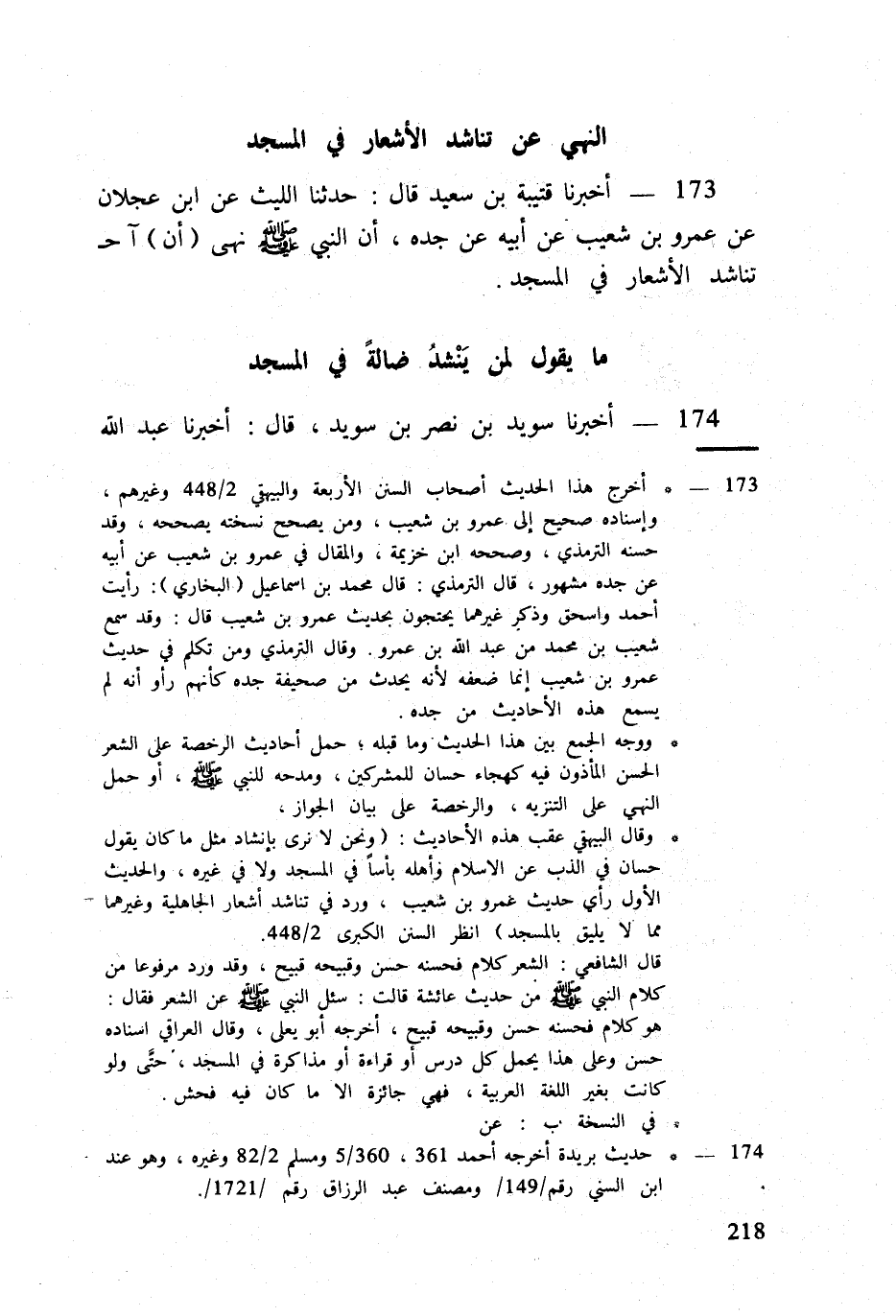 173 - أخبرنَا قُتَيْبَة بن سعيد قَالَ حَدثنَا اللَّيْث عَن ابْن عجلَان عَن عَمْرو بن شُعَيْب عَن أَبِيه عَن جده أَن النَّبِي صلى الله عَلَيْهِ وَسلم نهى (أَن) آح تناشد الْأَشْعَار فِي الْمَسْجِد