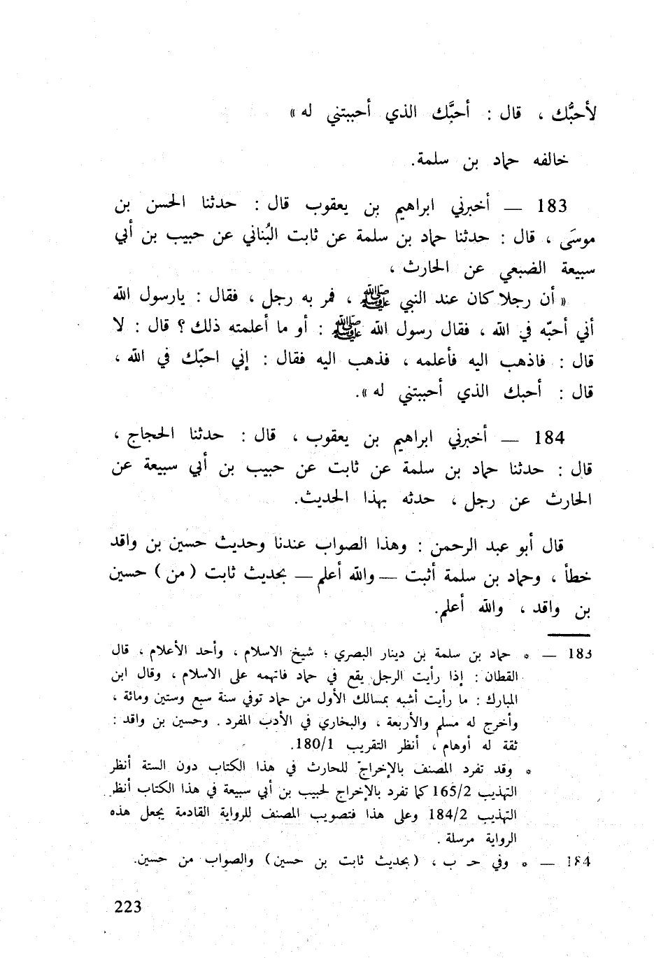 183 - أَخْبرنِي ابرهيم بن يَعْقُوب قَالَ حَدثنَا الْحسن بن مُوسَى قَالَ حَدثنَا حَمَّاد بن سَلمَة عَن ثَابت الْبنانِيّ عَن حبيب بن أبي سبيعة الضبعِي عَن الْحَارِث أَن رجلا كَانَ عِنْد النَّبِي صلى الله عَلَيْهِ وَسلم فَمر بِهِ رجل فَقَالَ يَا رَسُول الله إِنِّي أحبه فِي الله فَقَالَ رَسُول الله صلى الله عَلَيْهِ وَسلم