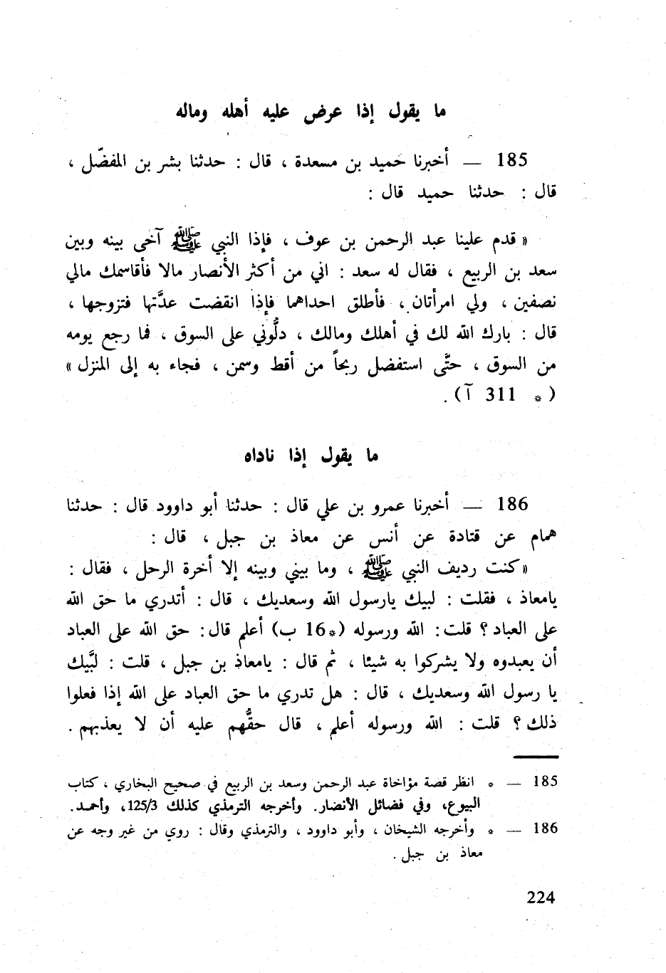 قدم علينا عبد الرَّحْمَن بن عَوْف فَإِذا النَّبِي صلى الله عَلَيْهِ وَسلم آخى بَينه وَبَين سعد بن الرّبيع فَقَالَ لَهُ سعد إِنِّي من أَكثر الْأَنْصَار مَالا فأقاسمك مَالِي نِصْفَيْنِ ولي امْرَأَتَانِ فَأطلق إِحْدَاهمَا فَإِذا انْقَضتْ عدَّتها فَتَزَوجهَا قَالَ بَارك الله لَك فِي أهلك وَمَالك دلوني على السُّوق فَمَا رَجَعَ يَوْمه من السُّوق حَتَّى استفضل ربحا من أقط وَسمن فجَاء بِهِ إِلَى الْمنزل (311 آ)