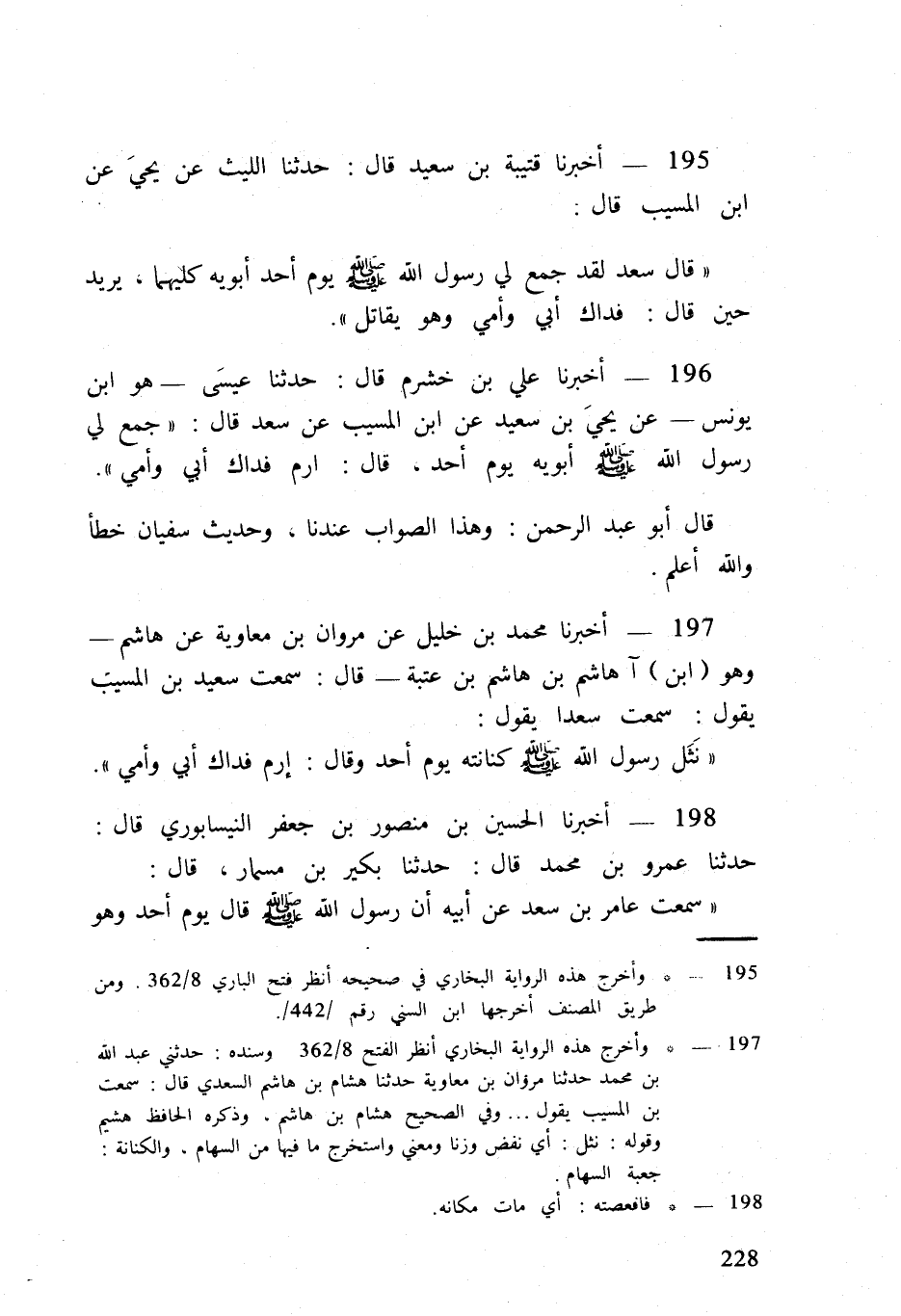 196 - أخبرنَا عَليّ بن خشرم قَالَ حَدثنَا عِيسَى هُوَ ابْن يُونُس عَن يحيى بن سعيد عَن ابْن الْمسيب عَن سعد قَالَ جمع لي رَسُول الله صلى الله عَلَيْهِ وَسلم أَبَوَيْهِ يَوْم أحد قَالَ