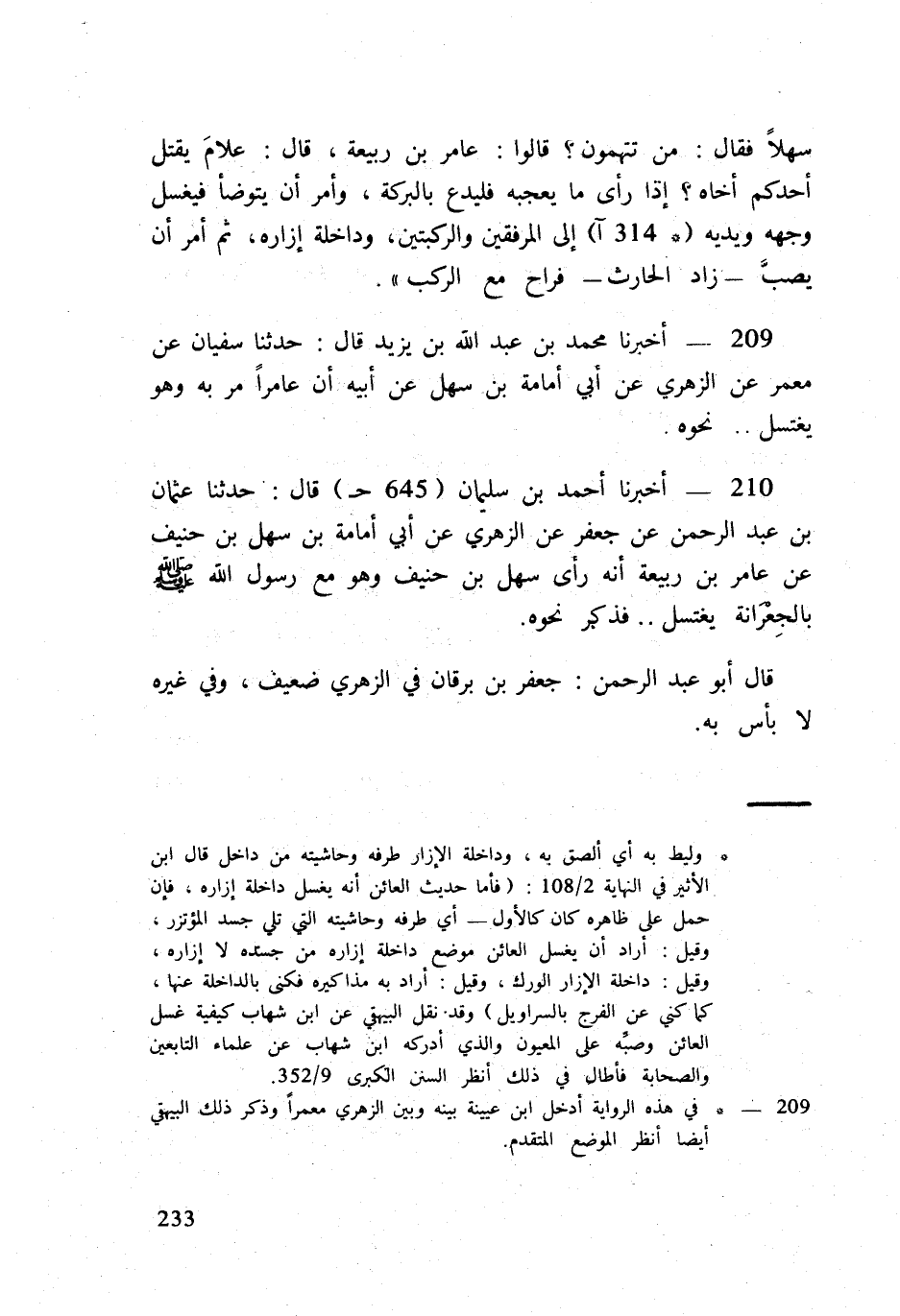 210 - أخبرنَا أَحْمد بن سُلَيْمَان (645 ح) قَالَ حَدثنَا عُثْمَان بن عبد الرَّحْمَن عَن جَعْفَر عَن الزُّهْرِيّ عَن أبي أُمَامَة بن سهل بن حنيف عَن عَامر بن ربيعَة أَنه رأى سهل بن حنيف وَهُوَ مَعَ رَسُول الله صلى الله عَلَيْهِ وَسلم بالجعرانة يغْتَسل فَذكر نَحوه