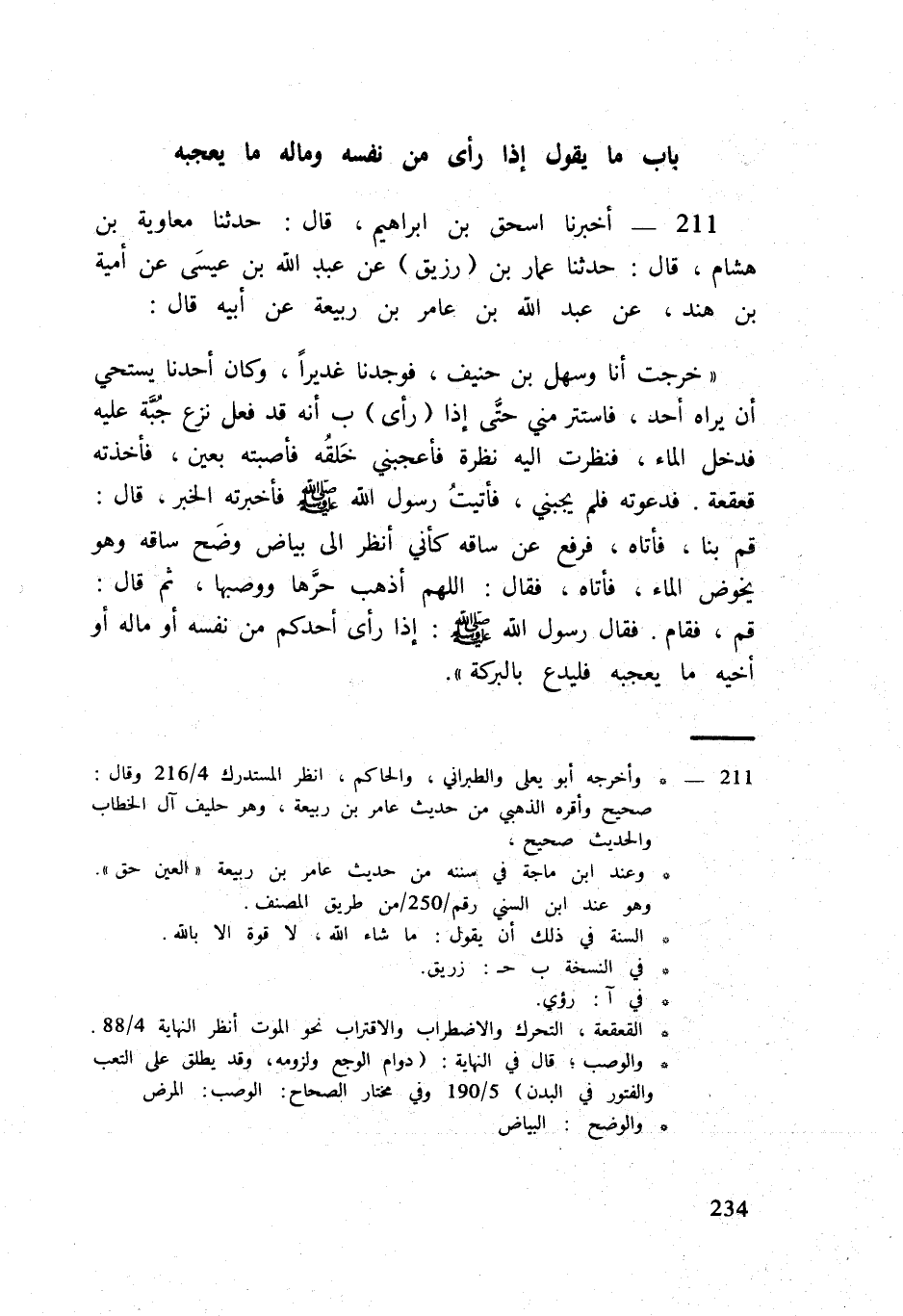 خرجت أَنا وَسَهل بن حنيف فَوَجَدنَا غديراً وَكَانَ أَحَدنَا يستحي أَن يرَاهُ أحد فاستتر مني حَتَّى إِذا (رأى) ب أَنه قد فعل نزع جُبَّة عَلَيْهِ فَدخل المَاء فَنَظَرت إِلَيْهِ نظرة فَأَعْجَبَنِي خلقه فَأَصَبْته بِعَين فَأَخَذته قعقعة فدعوته فَلم يجبني فَأتيت رَسُول الله صلى الله عَلَيْهِ وَسلم فَأَخْبَرته الْخَبَر قَالَ قُم بِنَا فَأَتَاهُ فَرفع عَن سَاقه كَأَنِّي أنظر إِلَى بَيَاض وضح سَاقه وَهُوَ يَخُوض المَاء فَأَتَاهُ فَقَالَ