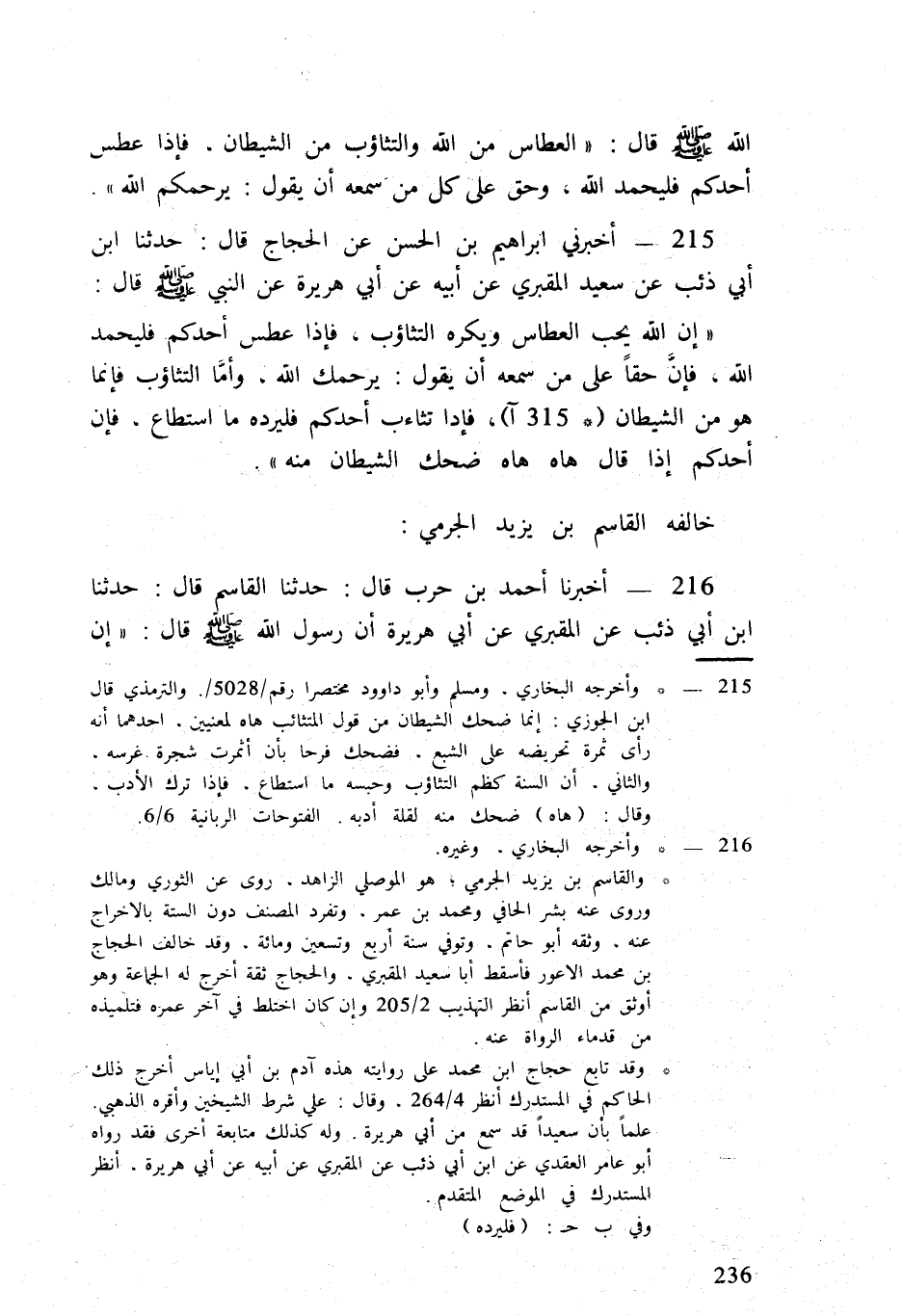 إِن الله يحب العطاس وَيكرهُ التثاؤب فَإِذا عطس أحدكُم فليحمد الله فإِن حَقًا على من سَمعه أَن يَقُول يَرْحَمك الله وَأما التثاؤب فَإِنَّمَا هُوَ من الشَّيْطَان (315 آ) فَإِذا تثاءب أحدكُم فليرده مَا اسْتَطَاعَ فإِن أحدكُم إِذا قَالَ هاه هاه ضحك الشَّيْطَان مِنْهُ