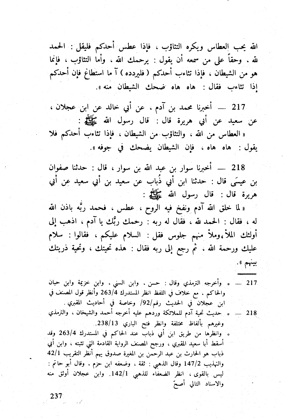 لما خلق الله آدم وَنفخ فِيهِ الرّوح عطس فَحَمدَ ربه باذن الله لَهُ فَقَالَ الْحَمد لله فَقَالَ لَهُ ربه رَحِمك رَبك يَا آدم اذْهَبْ إِلَى أُولَئِكَ الْمَلأ وملأ مِنْهُم جُلُوس فَقل السَّلَام عَلَيْكُم فَقَالُوا سَلام عَلَيْك ورحمه الله ثمَّ رَجَعَ إِلَى ربه فَقَالَ هَذِه تحيتك وتحية ذريتك بَينهم خَالفه مُحَمَّد بن عجلَان فِيهِ