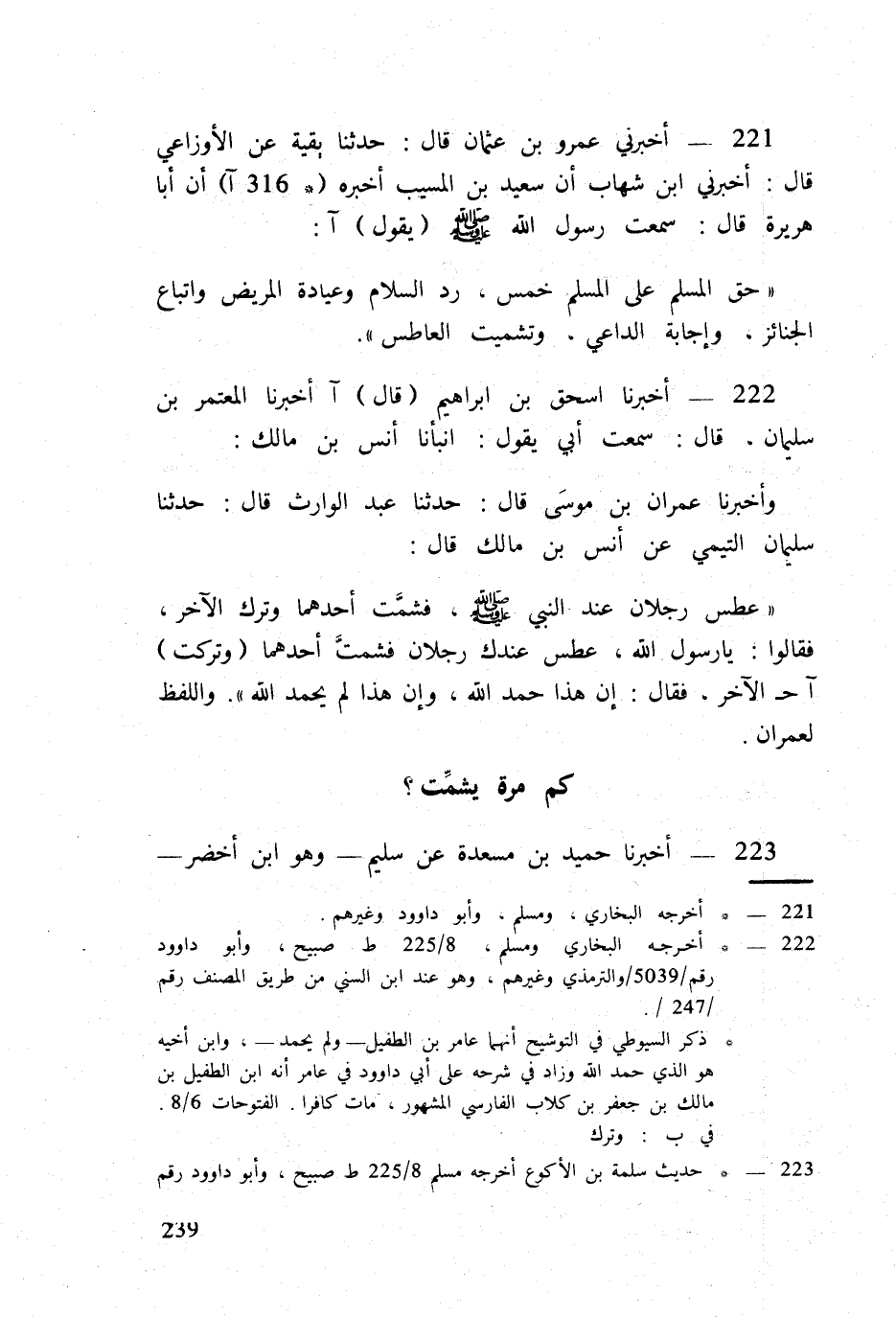 221 - أَخْبرنِي عَمْرو بن عُثْمَان قَالَ حَدثنَا بَقِيَّة عَن الْأَوْزَاعِيّ قَالَ أَخْبرنِي ابْن شهَاب أَن سعيد بن الْمسيب أخبرهُ (316 آ) أَن أَبَا هُرَيْرَة قَالَ سَمِعت رَسُول الله صلى الله عَلَيْهِ وَسلم (يَقُول) آ