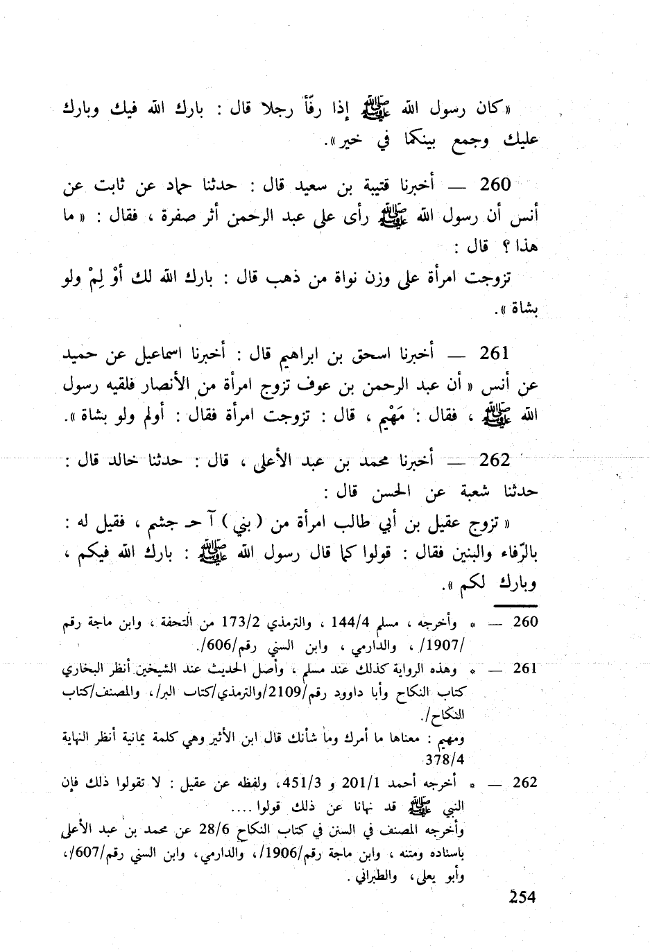 260 - أخبرنَا قُتَيْبَة بن سعيد قَالَ حَدثنَا حَمَّاد عَن ثَابت عَن أنس أَن رَسُول الله صلى الله عَلَيْهِ وَسلم رأى على عبد الرَّحْمَن أثر صفرَة فَقَالَ