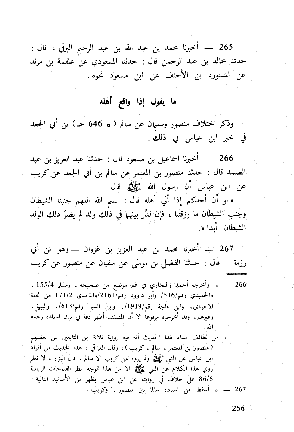266 - أخبرنَا اسماعيل بن مَسْعُود قَالَ حَدثنَا عبد الْعَزِيز بن عبد الصَّمد قَالَ حَدثنَا مَنْصُور بن الْمُعْتَمِر عَن سَالم بن أبي الْجَعْد عَن كريب عَن ابْن عَبَّاس أَن رَسُول الله صلى الله عَلَيْهِ وَسلم قَالَ