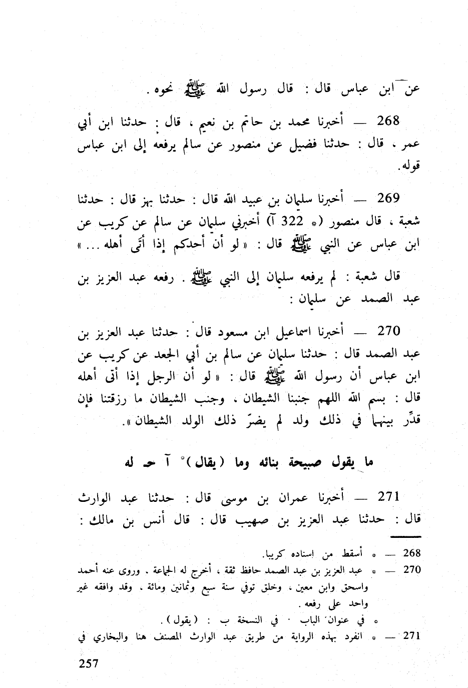 269 - أخبرنَا سُلَيْمَان بن عبيد الله قَالَ حَدثنَا بهز قَالَ حَدثنَا شُعْبَة قَالَ مَنْصُور (322 آ) أَخْبرنِي سُلَيْمَان عَن سَالم عَن كريب عَن ابْن عَبَّاس عَن النَّبِي صلى الله عَلَيْهِ وَسلم قَالَ