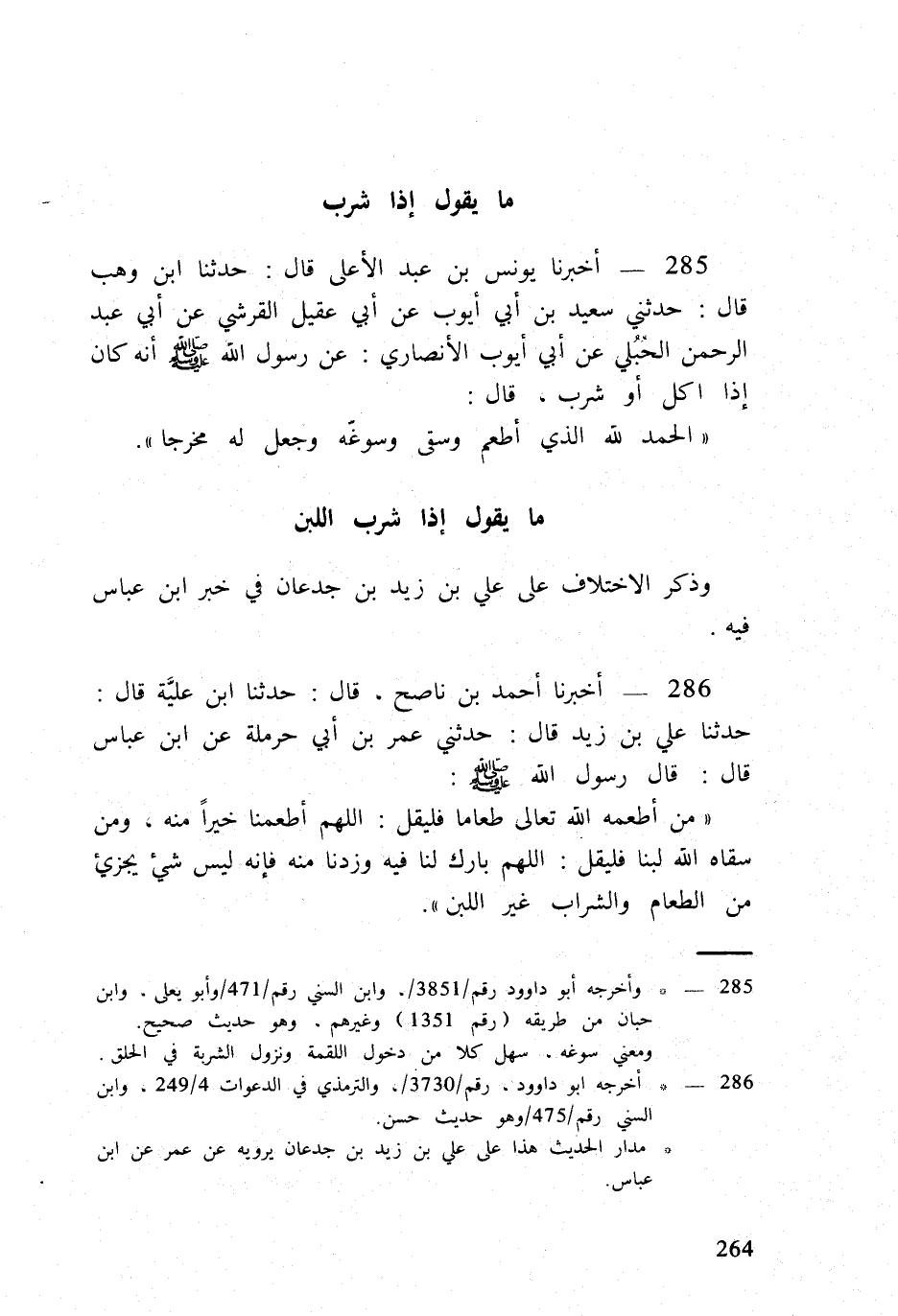 285 - أخبرنَا يُونُس بن عبد الْأَعْلَى قَالَ حَدثنَا ابْن وهب قَالَ حَدثنِي سعيد بن أبي أَيُّوب عَن ابي عقيل الْقرشِي عَن أبي عبد الرَّحْمَن الحبلي عَن أبي أَيُّوب الْأنْصَارِيّ عَن رَسُول الله صلى الله عَلَيْهِ وَسلم أَنه كَانَ إِذا أكل أَو شرب قَالَ