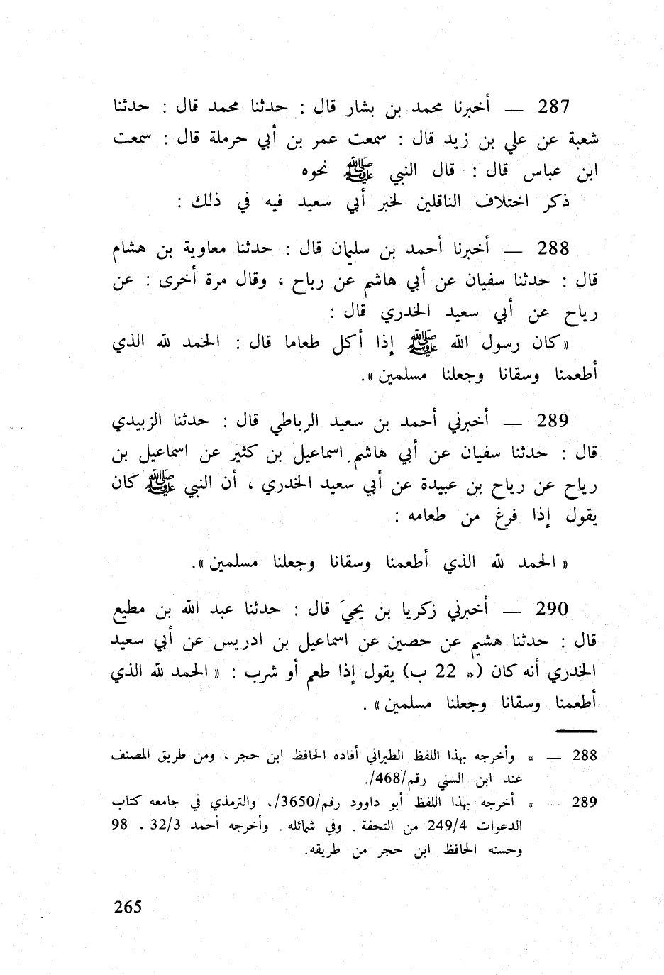 290 - أَخْبرنِي زَكَرِيَّا بن يحيى قَالَ حَدثنَا عبد الله بن مُطِيع قَالَ حَدثنَا هشيم عَن حُصَيْن عَن اسماعيل بن ادريس عَن أبي سعيد الْخُدْرِيّ أَنه كَانَ (22 ب) يَقُول إِذا طعم أَو شرب