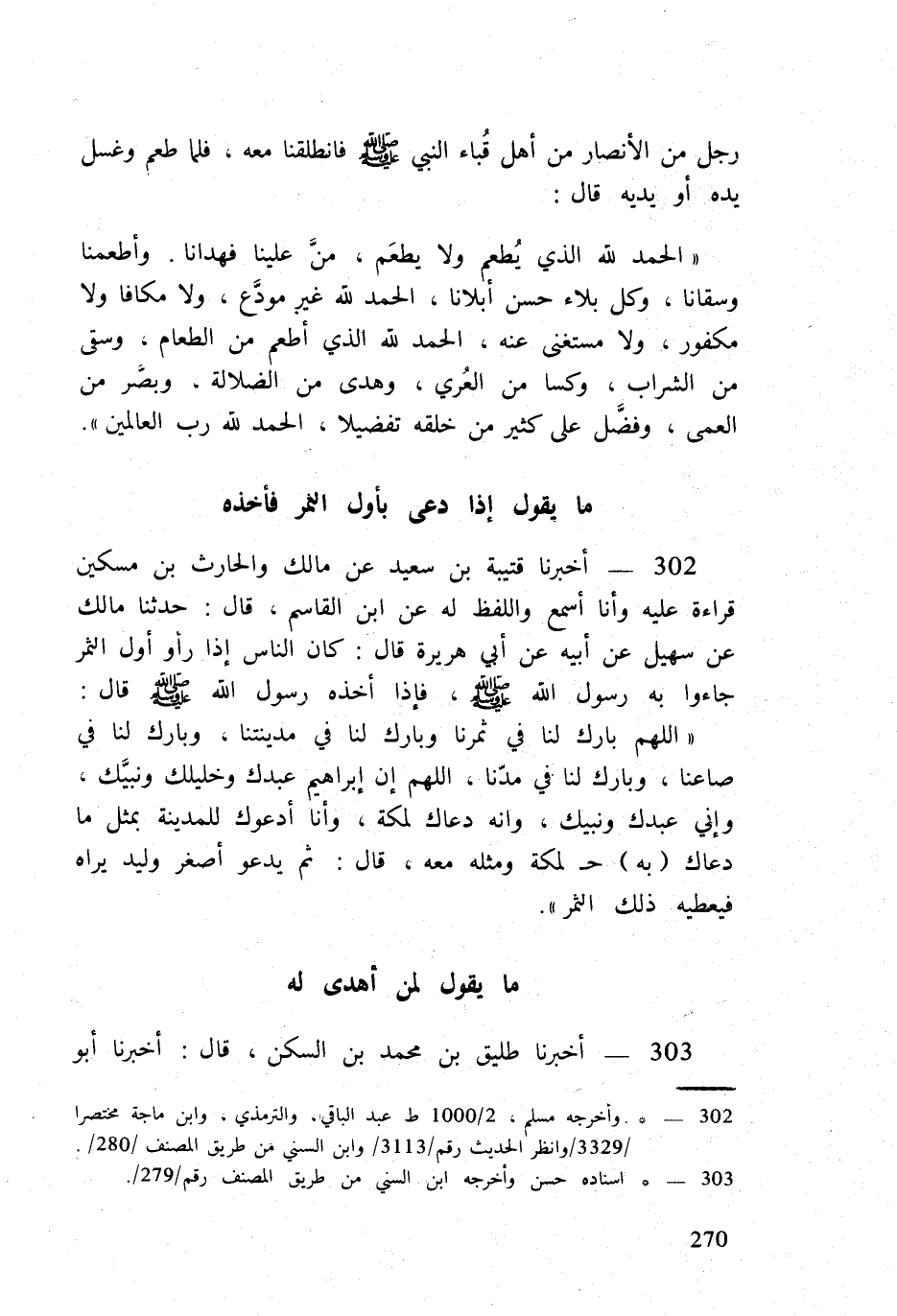 302 - أخبرنَا قُتَيْبَة بن سعيد عَن مَالك والْحَارث بن مِسْكين قِرَاءَة عَلَيْهِ وَأَنا أسمع وَاللَّفْظ لَهُ عَن ابْن الْقَاسِم قَالَ حَدثنَا مَالك عَن سُهَيْل عَن أَبِيه عَن أبي هُرَيْرَة قَالَ كَانَ النَّاس إِذا رأو أول الثَّمر جَاءُوا بِهِ رَسُول الله صلى الله عَلَيْهِ وَسلم فإِذا أَخذه رَسُول الله صلى الله عَلَيْهِ وَسلم قَالَ