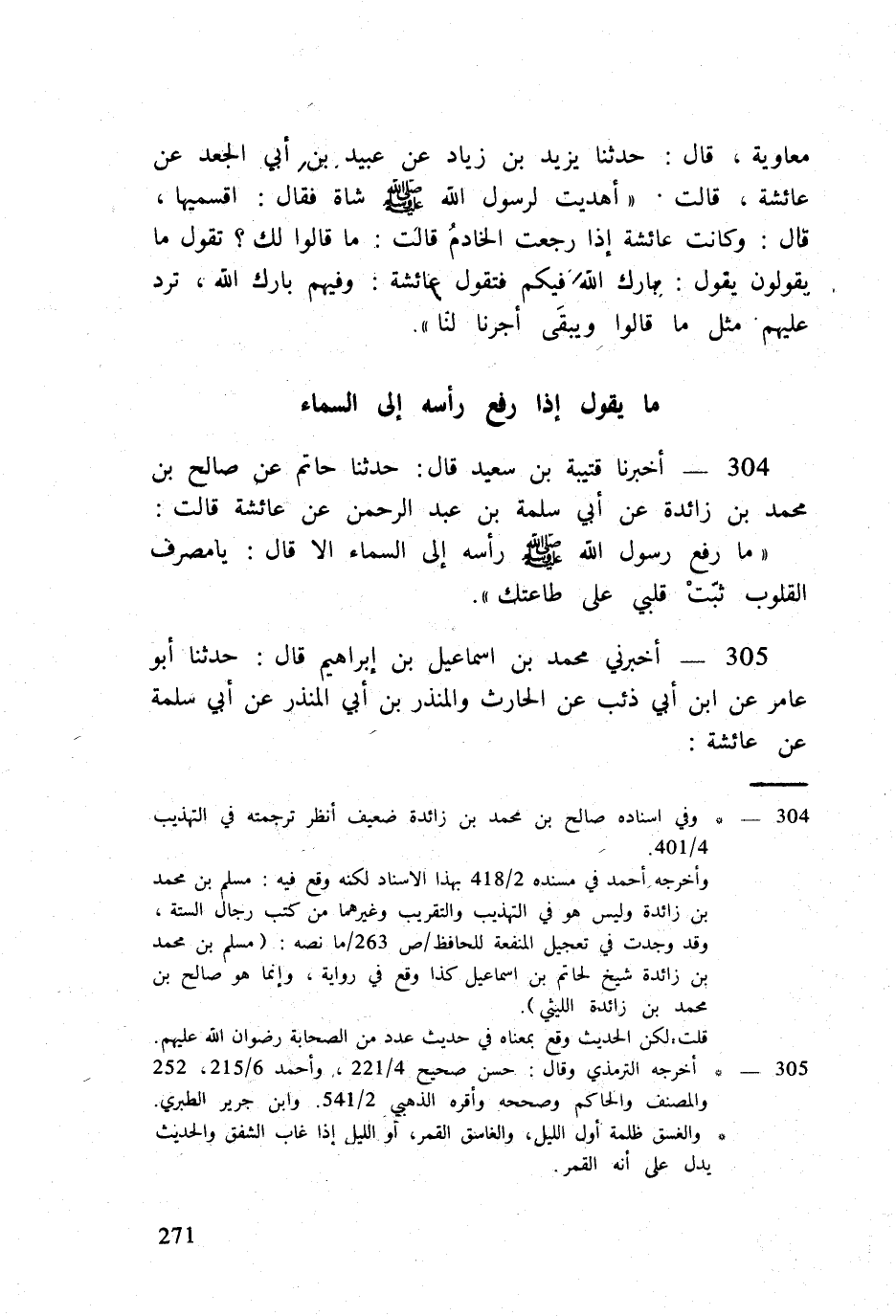 304 - أخبرنَا قُتَيْبَة بن سعيد قَالَ حَدثنَا حَاتِم عَن صَالح بن مُحَمَّد بن زَائِدَة عَن أبي سَلمَة بن عبد الرَّحْمَن عَن عَائِشَة قَالَت