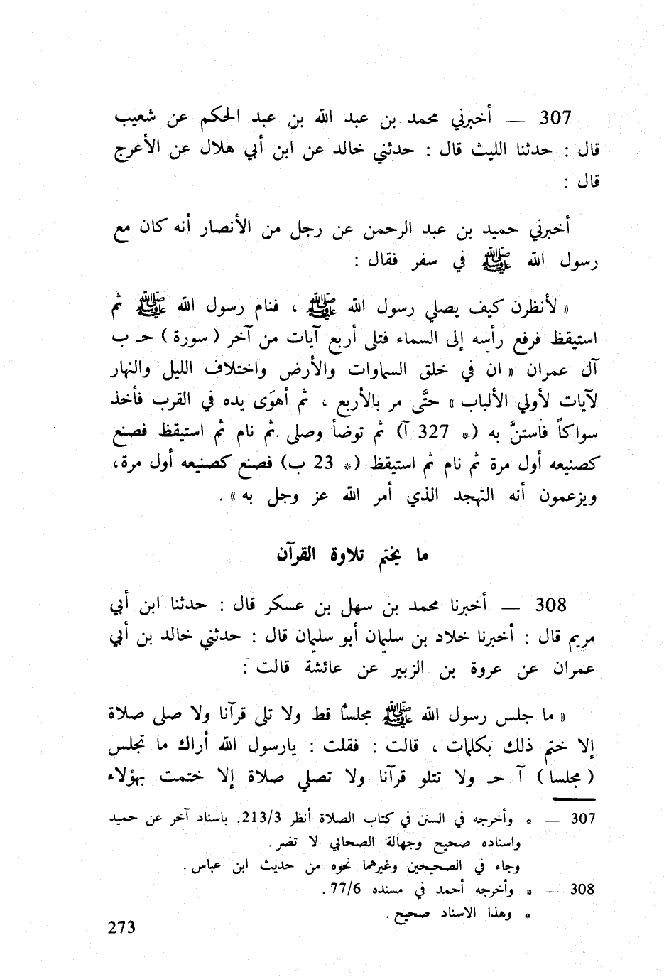 لأنظرن كَيفَ يُصَلِّي رَسُول الله صلى الله عَلَيْهِ وَسلم فَنَامَ رَسُول الله صلى الله عَلَيْهِ وَسلم ثمَّ اسْتَيْقَظَ فَرفع رَأسه إِلَى السَّمَاء فتلى أَربع آيَات من آخر (سُورَة) ح ب آل عمرَان {إِن فِي خلق السَّمَاوَات وَالْأَرْض وَاخْتِلَاف اللَّيْل وَالنَّهَار لآيَات لأولى الْأَلْبَاب} حَتَّى مرَّ بالأربع ثمَّ أَهْوى يَده فِي الْقرب فَأخذ سواكا فاستن بِهِ (327 آ) ثمَّ تَوَضَّأ وَصلى ثمَّ نَام ثمَّ اسْتَيْقَظَ فَصنعَ كصنيعه أول مرّة ثمَّ نَام ثمَّ اسْتَيْقَظَ (23 ب) فَصنعَ كصنيعه أول مرّة ويزعمون أَنه التَّهَجُّد الَّذِي أَمر الله عزَّ وجلَّ بِهِ