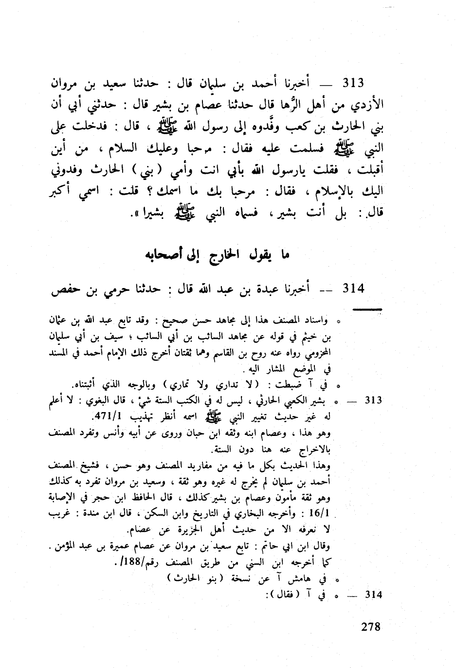 313 - أخبرنَا أَحْمد بن سُلَيْمَان قَالَ حَدثنَا سعيد بن مَرْوَان الْأَزْدِيّ من أهل الرها قَالَ حَدثنَا عِصَام بن بشير قَالَ حَدثنِي أبي ان بني الْحَارِث بن كَعْب وفدوة إِلَى رَسُول الله صلى الله عَلَيْهِ وَسلم قَالَ فَدخلت على النَّبِي صلى الله عَلَيْهِ وَسلم فَسلمت عَلَيْهِ فَقَالَ