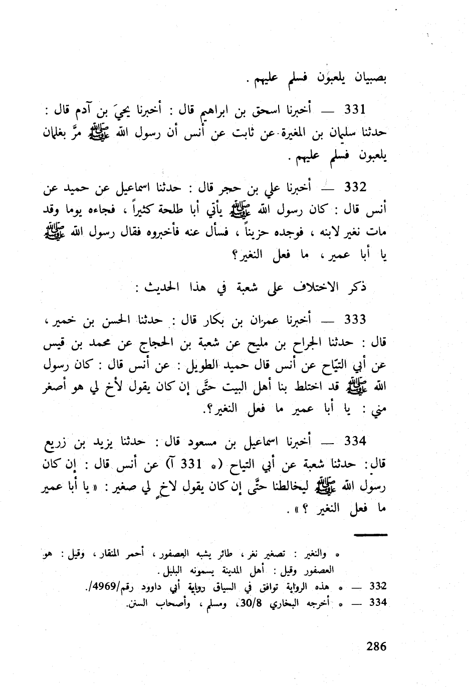 334 - أخبرنَا اسماعيل بن مَسْعُود قَالَ حَدثنَا يزِيد بن زُرَيْع قَالَ حَدثنَا شُعْبَة عَن أبي التياح (331 آ) عَن أنس قَالَ إِن كَانَ رَسُول الله صلى الله عَلَيْهِ وَسلم ليخالطنا حَتَّى إِن كَانَ يَقُول لأخٍ لي صَغِير