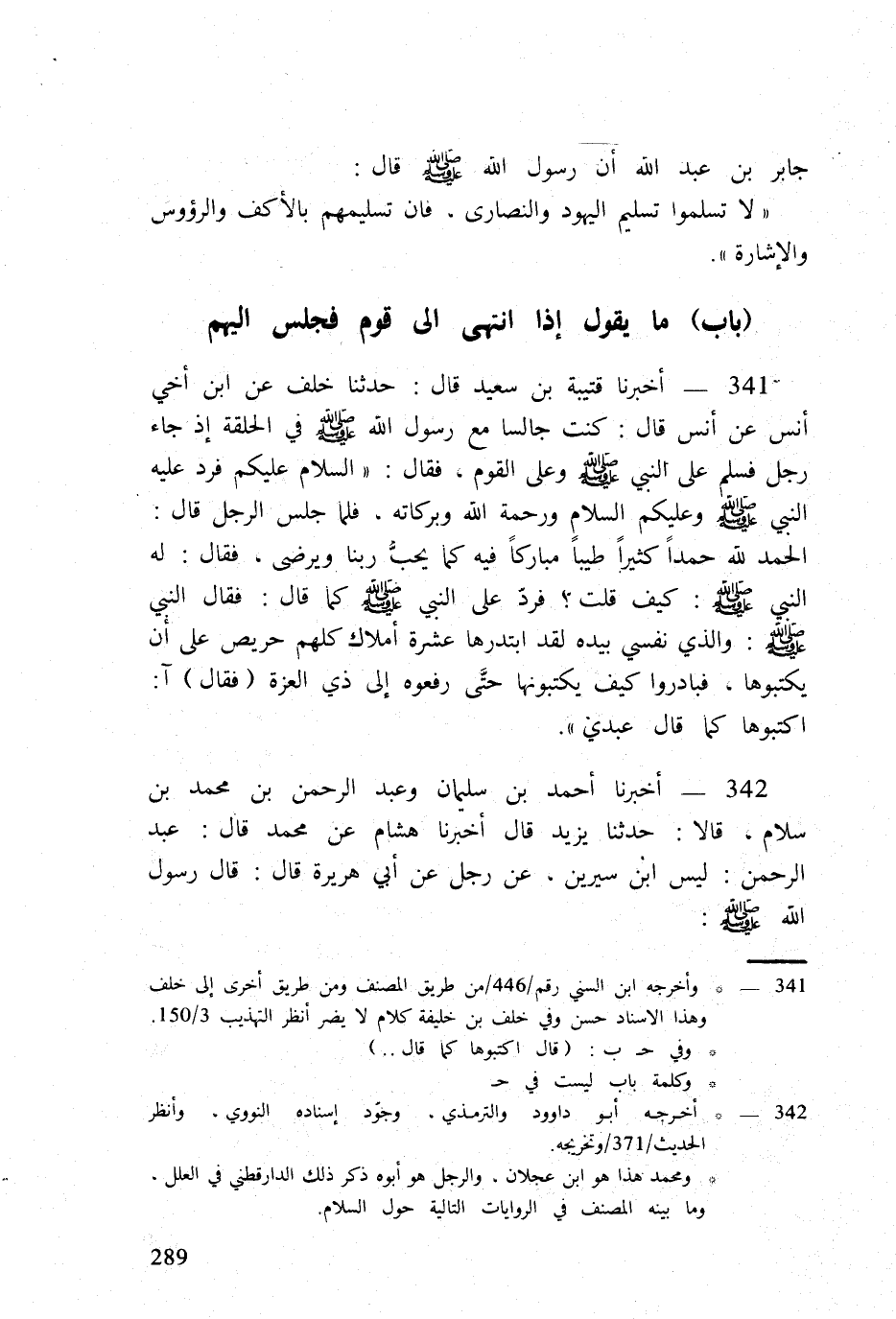 341 - أخبرنَا قُتَيْبَة بن سعيد قَالَ حَدثنَا خلف عَن ابْن أخي أنس عَن أنس قَالَ كنت جَالِسا مَعَ رَسُول الله صلى الله عَلَيْهِ وَسلم فِي الْحلقَة إِذْ جَاءَ رجل فَسلم على النَّبِي صلى الله عَلَيْهِ وَسلم وعَلى الْقَوْم فَقَالَ السَّلَام عَلَيْكُم فَرد عَلَيْهِ النَّبِي صلى الله عَلَيْهِ وَسلم