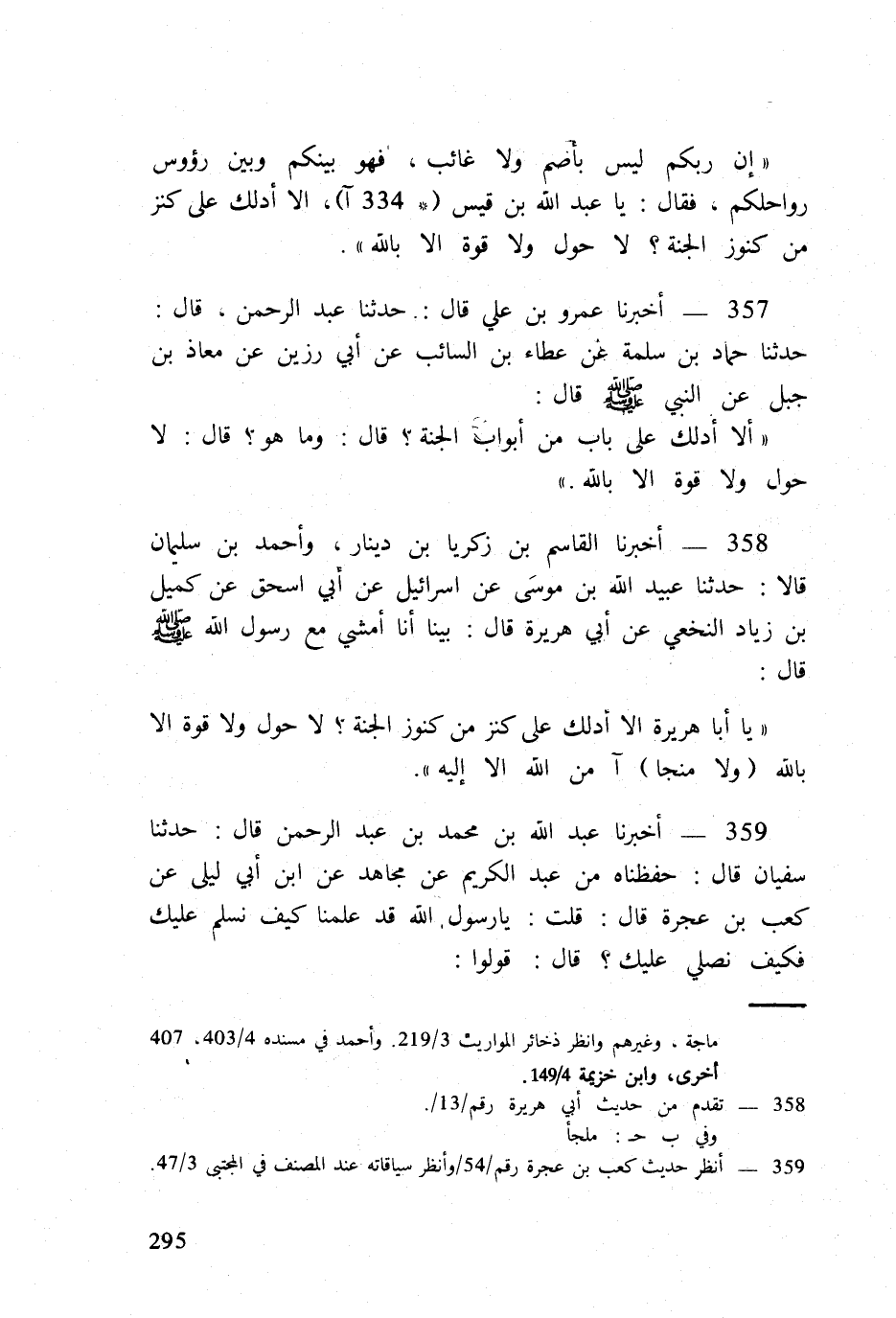 يَا أَبَا هُرَيْرَة أَلا أدلك على كنز من كنوز الْجنَّة لَا حول وَلَا قُوَّة إِلَّا بِاللَّه (وَلَا منجا) آمن الله إِلَّا إِلَيْهِ
