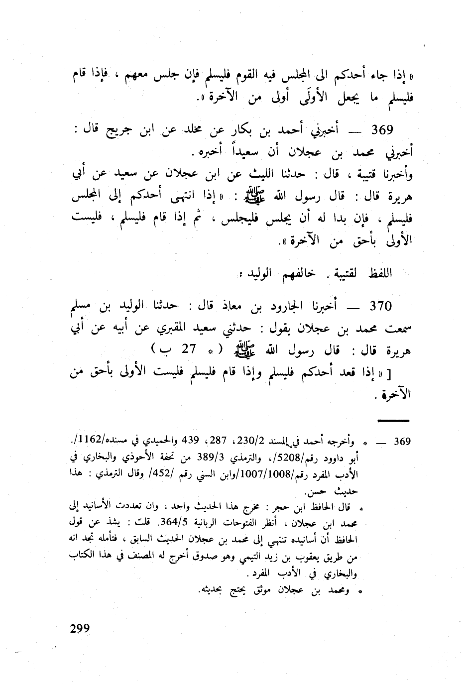 370 - أخبرنَا الْجَارُود بن معَاذ قَالَ حَدثنَا الْوَلِيد بن مُسلم سَمِعت مُحَمَّد بن عجلَان يَقُول حَدثنِي سعيد المَقْبُري عَن أَبِيه عَن ابي هُرَيْرَة قَالَ قَالَ رَسُول الله صلى الله عَلَيْهِ وَسلم (27 ب)