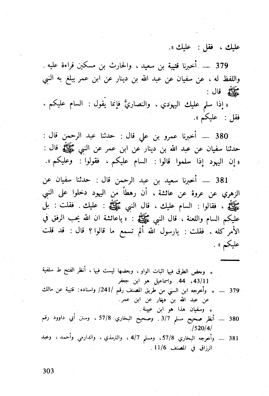381 - أخبرنَا سعيد بن عبد الرَّحْمَن قَالَ حَدثنَا سُفْيَان عَن الزُّهْرِيّ عَن عُرْوَة عَن عَائِشَة أَن رهطاً من الْيَهُود دخلُوا على النَّبِي صلى الله عَلَيْهِ وَسلم فَقَالُوا السام عَلَيْك قَالَ النَّبِي صلى الله عَلَيْهِ وَسلم عَلَيْك فَقلت بل عَلَيْكُم السام واللعنة قَالَ النَّبِي صلى الله عَلَيْهِ وَسلم