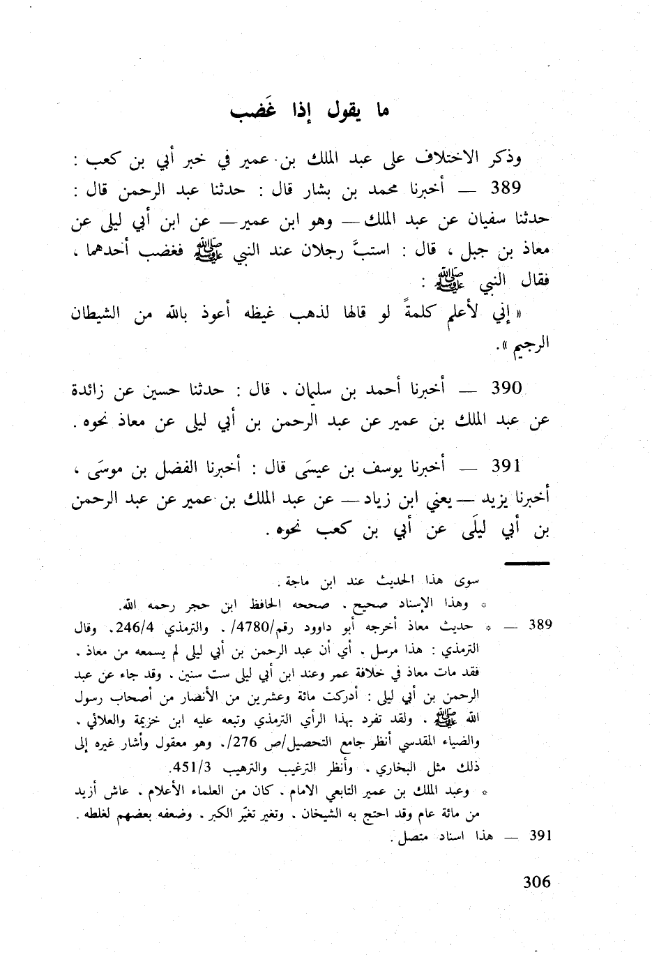 389 - أخبرنَا مُحَمَّد بن بشار قَالَ حَدثنَا عبد الرَّحْمَن قَالَ حَدثنَا سُفْيَان عَن عبد الْملك وَهُوَ ابْن عُمَيْر عَن ابْن أبي ليلى عَن معَاذ بن جبل قَالَ إستبَّ رجلَانِ عِنْد النَّبِي صلى الله عَلَيْهِ وَسلم فَغَضب أَحدهمَا فَقَالَ النَّبِي صلى الله عَلَيْهِ وَسلم