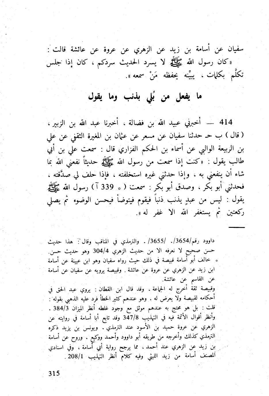414 - أَخْبرنِي عبيد الله بن فضَالة أخبرنَا عبد الله بن الزبير (قَالَ) ب ج حَدثنَا سُفْيَان عَن مسعر عَن عُثْمَان بن الْمُغيرَة الثَّقَفِيّ عَن عَليّ بن الربيعة الْوَالِبِي عَن أَسمَاء بن الحكم الْفَزارِيّ قَالَ سَمِعت عَليّ بن أبي طَالب يَقُول كنت إِذا سَمِعت من رَسُول الله صلى الله عَلَيْهِ وَسلم حَدِيثا نَفَعَنِي الله بِمَا شَاءَ أَن يَنْفَعنِي بِهِ وَإِذا حَدثنِي غَيره استخلفته فإِذا حلف لي صدَّقته فَحَدثني أَبُو بكر وَصدق أَبُو بكر سَمِعت (339 آ) رَسُول الله صلى الله عَلَيْهِ وَسلم يَقُول