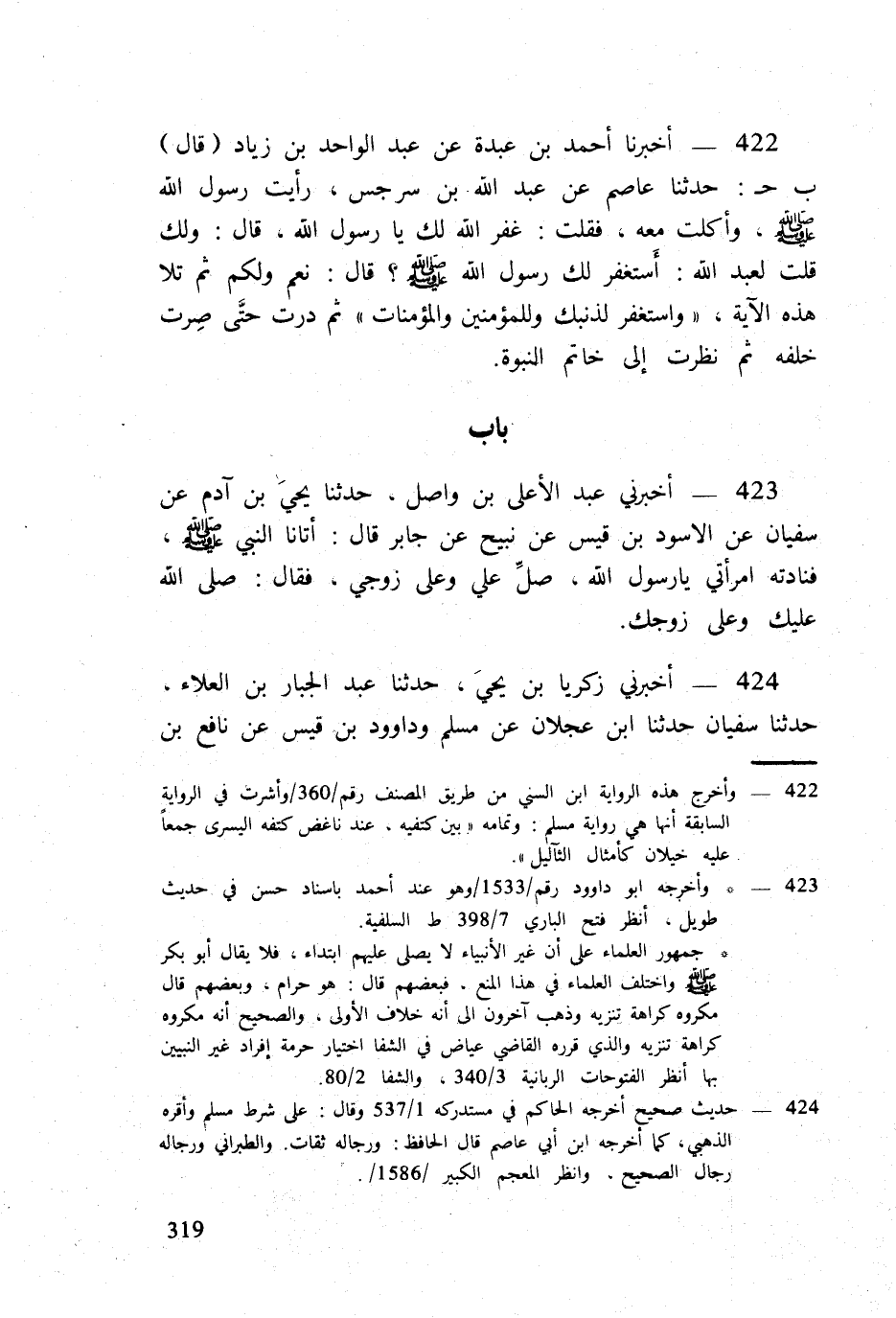 422 - أخبرنَا أَحْمد بن عَبدة عَن عبد الْوَاحِد بن زِيَاد (قَالَ) ب ح حَدثنَا عَاصِم عَن عبد الله بن سرجس رَأَيْت رَسُول الله صلى الله عَلَيْهِ وَسلم وأكلت مَعَه فَقلت غفر الله لَك يَا رَسُول الله قَالَ