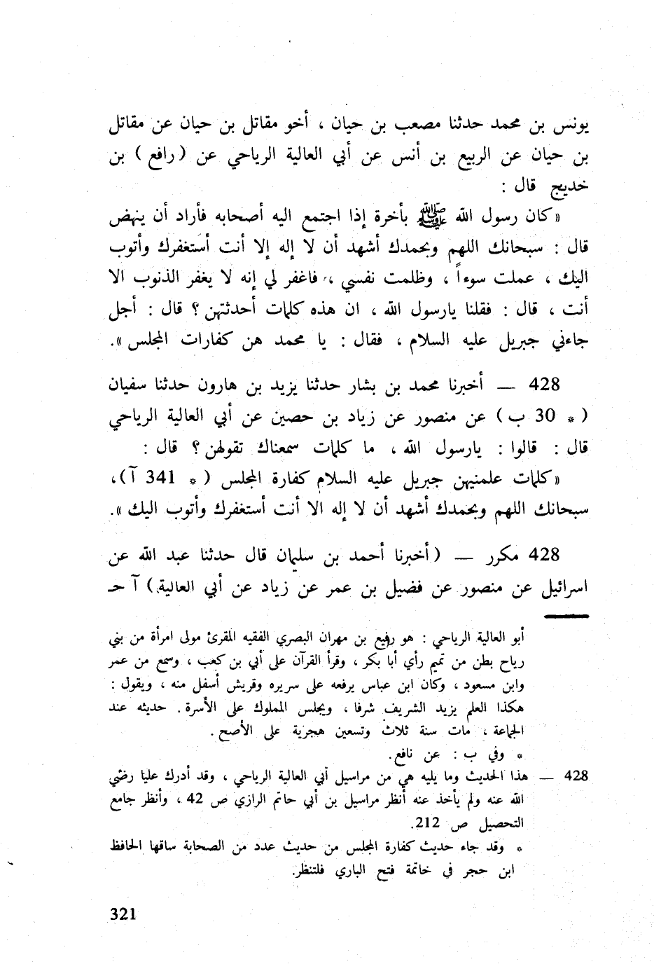428 - أخبرنَا مُحَمَّد بن بشار حَدثنَا يزِيد بن هَارُون حَدثنَا سُفْيَان (30 ب) عَن مَنْصُور عَن زِيَاد بن حُصَيْن عَن أبي الْعَالِيَة الرايحي قَالَ قَالُوا يَا رَسُول الله مَا كَلِمَات سمعناك تقولهن قَالَ