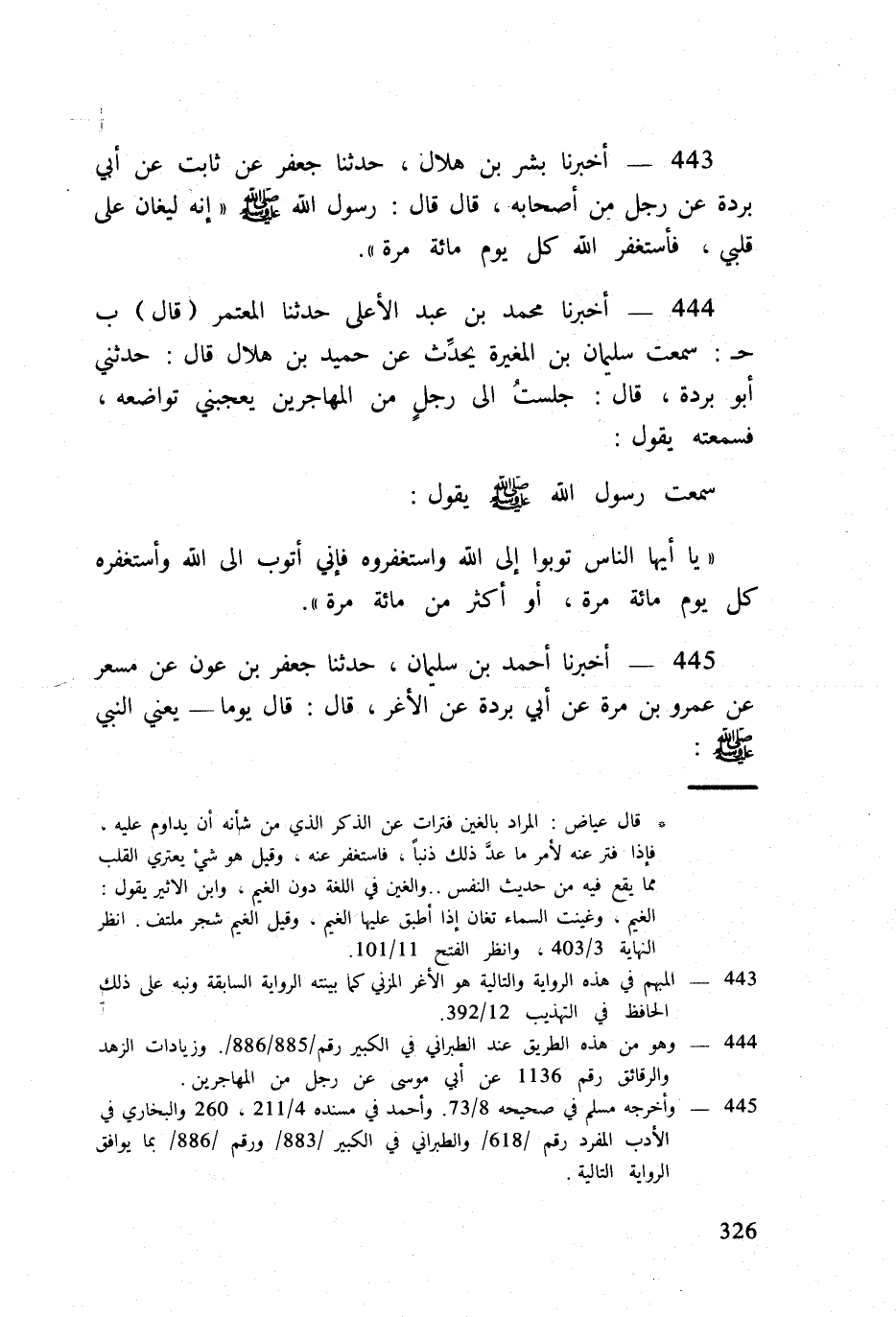 445 - أخبرنَا أَحْمد بن سُلَيْمَان حَدثنَا جَعْفَر بن عون عَن مسعر عَن عَمْرو بن مرّة عَن أبي بردة عَن الْأَغَر قَالَ قَالَ يَوْمًا يَعْنِي النَّبِي صلى الله عَلَيْهِ وَسلم