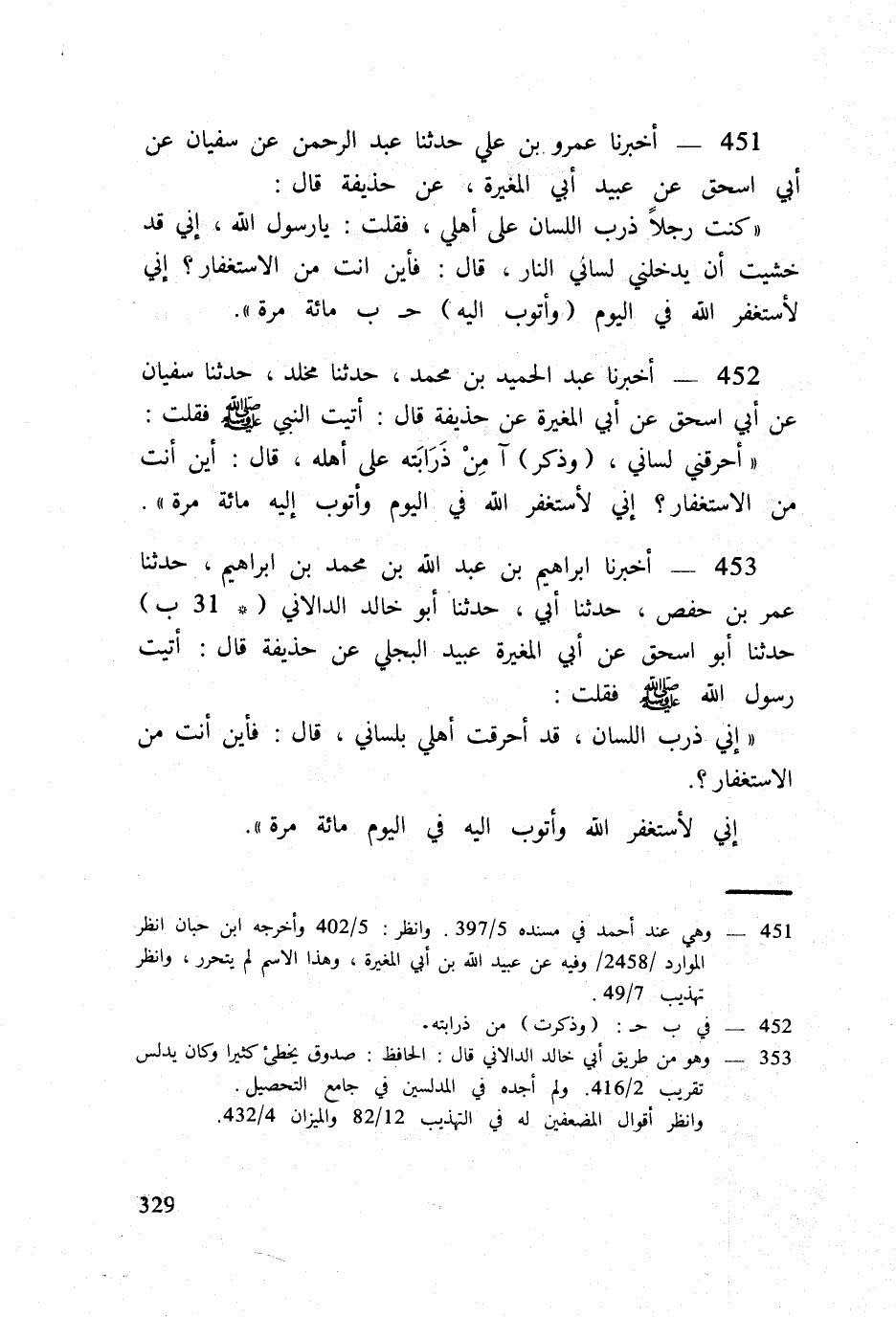 451 - أخبرنَا عَمْرو بن عَليّ حَدثنَا عبد الرَّحْمَن عَن سُفْيَان عَن أبي اسحق عَن عبيد أبي الْمُغيرَة عَن حُذَيْفَة قَالَ