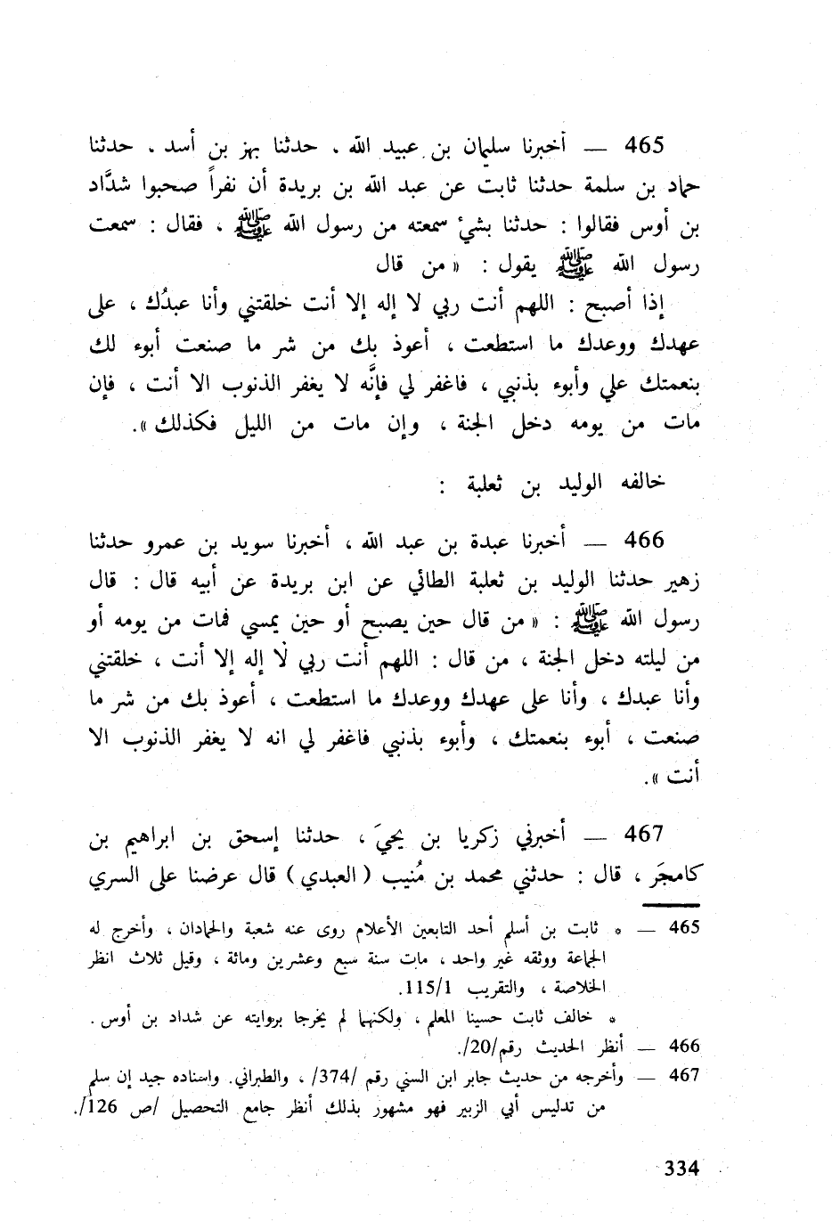 465 - أخبرنَا سُلَيْمَان بن عبيد الله حَدثنَا بهز بن أَسد حَدثنَا حَمَّاد بن سَلمَة حَدثنَا ثَابت عَن عبد الله بن بُرَيْدَة أَن نَفرا صحبوا شدّاد بن أَوْس فَقَالُوا حَدثنَا بِشَيْء سمعته من رَسُول الله صلى الله عَلَيْهِ وَسلم فَقَالَ سَمِعت رَسُول الله صلى الله عَلَيْهِ وَسلم يَقُول