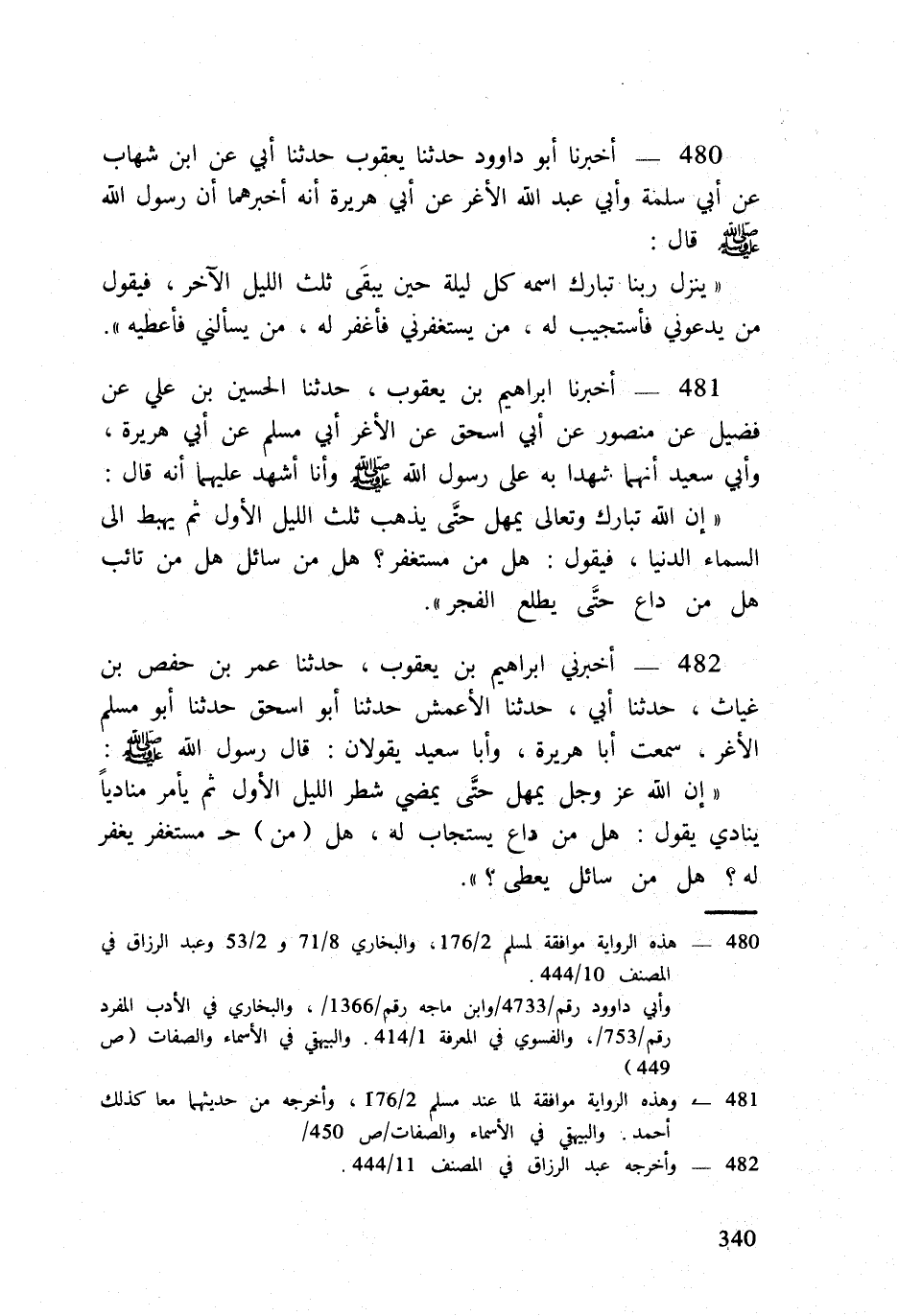 480 - أخبرنَا أَبُو دَاوُود حَدثنَا يَعْقُوب حَدثنَا ابي عَن ابْن شهَاب عَن أبي سَلمَة وَأبي عبد الله الْأَغَر عَن أبي هُرَيْرَة أَنه أخبرهما أَن رَسُول الله صلى الله عَلَيْهِ وَسلم قَالَ