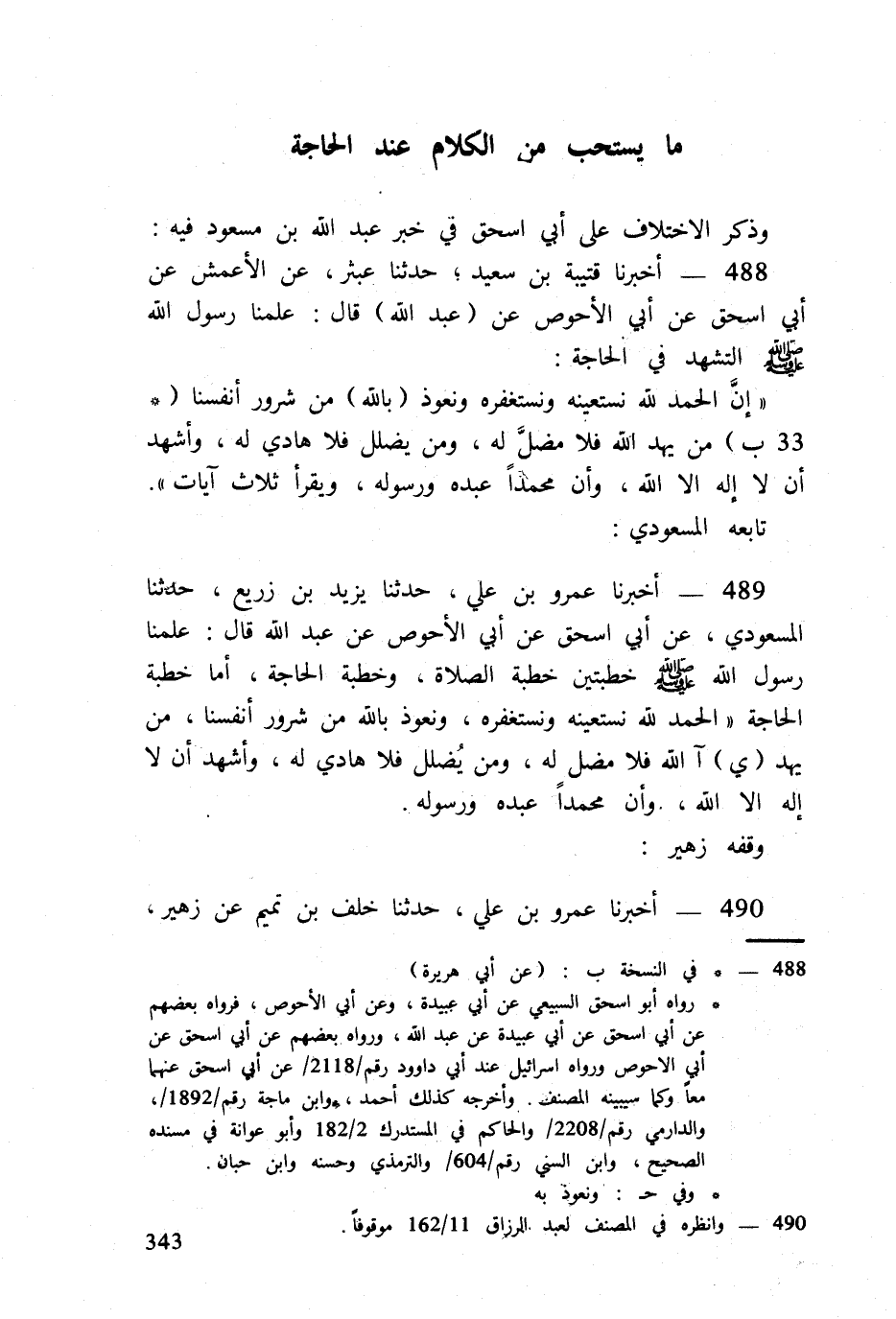 489 - أخبرنَا عَمْرو بن عَليّ حَدثنَا يزِيد بن زُرَيْع حَدثنَا المَسْعُودِيّ عَن أبي اسحق عَن أبي الْأَحْوَص عَن عبد الله قَالَ علمنَا رَسُول الله صلى الله عَلَيْهِ وَسلم خطبتين خطْبَة الصَّلَاة وخطبة الْحَاجة أما خطْبَة الْحَاجة
