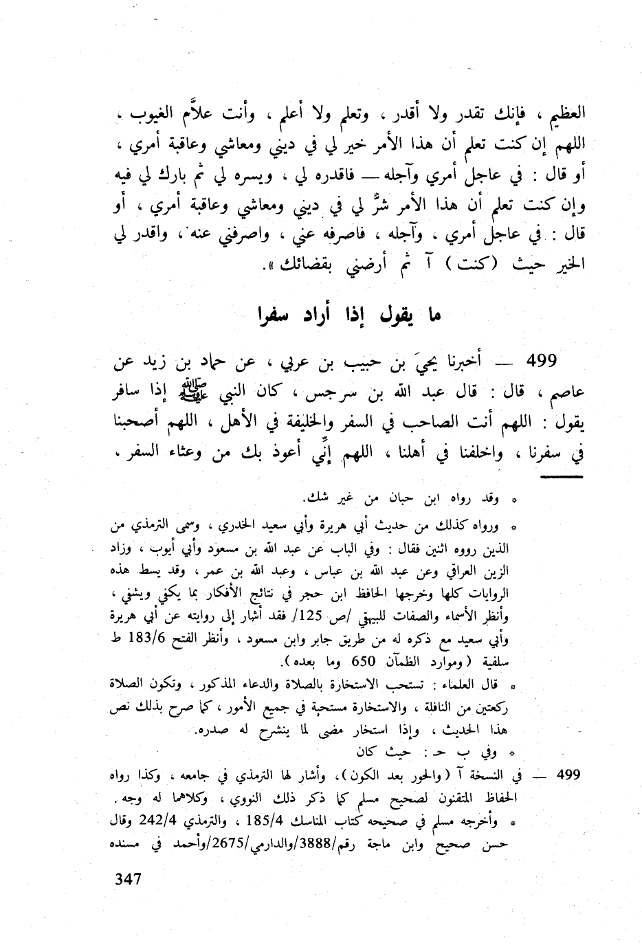 499 - أخبرنَا يحي بن حبيب بن عَرَبِيّ عَن حَمَّاد بن زيد عَن عَاصِم قَالَ قَالَ عبد الله بن سرجس كَانَ النَّبِي صلى الله عَلَيْهِ وَسلم إِذا سَافر يَقُول