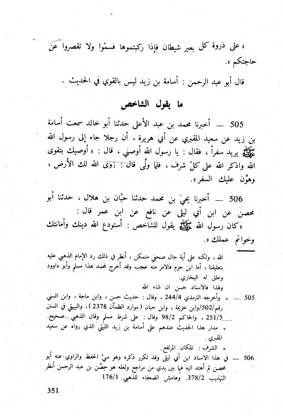 505 - أخبرنَا مُحَمَّد بن عبد الْأَعْلَى حَدثنَا أَبُو خَالِد سَمِعت اسامة بن زيد عَن سعيد المَقْبُري عَن أبي هُرَيْرَة أَن رجلا جَاءَ إِلَى رَسُول الله صلى الله عَلَيْهِ وَسلم يُرِيد سفرا فَقَالَ يَا رَسُول الله أوصني قَالَ