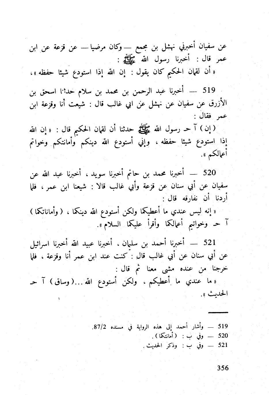 520 - أخبرنَا مُحَمَّد بن حَاتِم أخبرنَا سُوَيْد أخبرنَا عبد الله عَن سُفْيَان عَن أبي سِنَان عَن قزعة وَأبي غَالب قَالَا شيعنا ابْن عمر فَلَمَّا أردنَا أَن نفارقه قَالَ