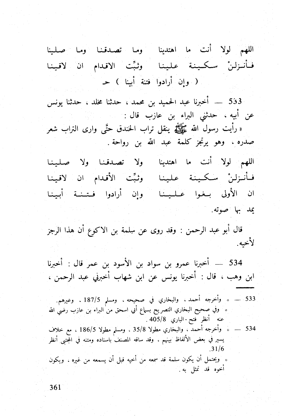 رَأَيْت رَسُول الله صلى الله عَلَيْهِ وَسلم ينْقل تُرَاب الخَنْدَق حَتَّى وارى التُّرَاب شعر صَدره وَهُوَ يرتجز كلمة عبد الله بن رَوَاحَة ... اللَّهُمَّ لَوْلَا أَنْت مَا اهتدينا ... وَلَا تصدقنا وَلَا صلينَا
