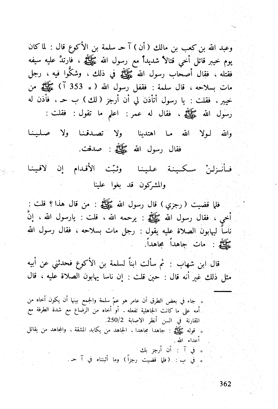وَعبد الله بن كَعْب بن مَالك (أَن) آح سَلمَة بن الْأَكْوَع قَالَ لما كَانَ يَوْم خَيْبَر قَاتل أخي قتالا شَدِيدا مَعَ رَسُول الله صلى الله عَلَيْهِ وَسلم فَارْتَد عَلَيْهِ سَيْفه فقلته فَقَالَ أَصْحَاب رَسُول الله صلى الله عَلَيْهِ وَسلم فِي ذَلِك وَشَكوا فِيهِ رجل مَاتَ بسلاحه قَالَ سَلمَة فقفل رَسُول الله (353 آ) صلى الله عَلَيْهِ وَسلم من خَيْبَر فَقلت يَا رَسُول أتأذن لي أَن أرجز (لَك) ب ح فَأذن لَهُ رَسُول الله صلى الله عَلَيْهِ وَسلم فَقَالَ لَهُ عمر اعْلَم مَا تَقول فَقلت ... وَالله لَوْلَا الله مَا اهتدينا ... وَلَا تصدقنا وَلَا صلينَا ... فَقَالَ رَسُول الله صلى الله عَلَيْهِ وَسلم صدقت ... فأنزلن سكنة علينا ... وَثَبت الْأَقْدَام إِن لاقينا