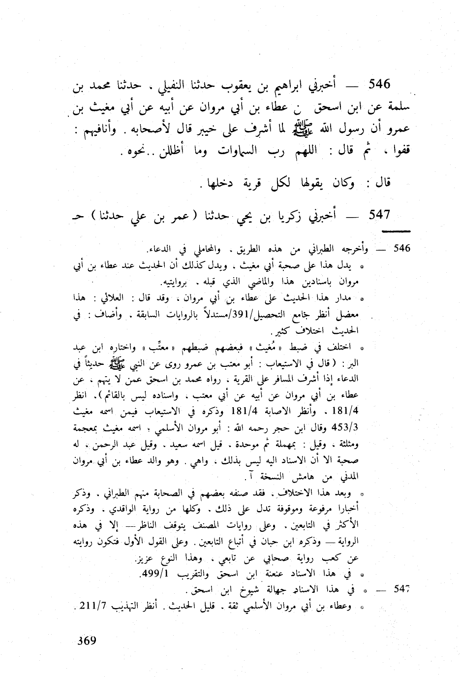 546 - أَخْبرنِي ابراهيم بن يَعْقُوب حَدثنَا النُّفَيْلِي حَدثنَا مُحَمَّد بن سَلمَة عَن ابْن اسحق عَن عَطاء بن أبي مَرْوَان عَن أَبِيه عَن أبي مغيث بن عَمْرو أَن رَسُول الله صلى الله عَلَيْهِ وَسلم لما أشرف على خَيْبَر قَالَ لأَصْحَابه وأنافيهم قفوا ثمَّ